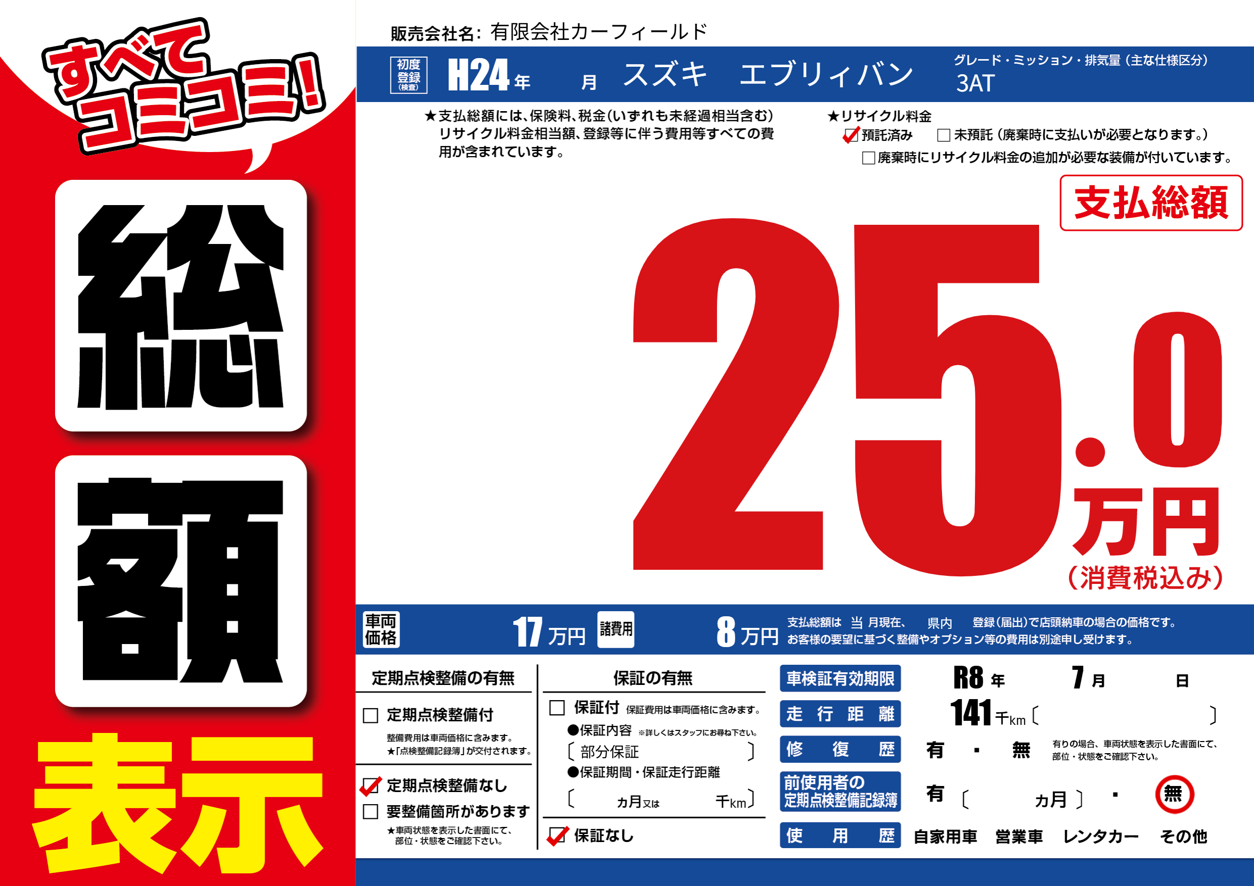 | 車検制限 | R8年 7月 - 日 | ||
