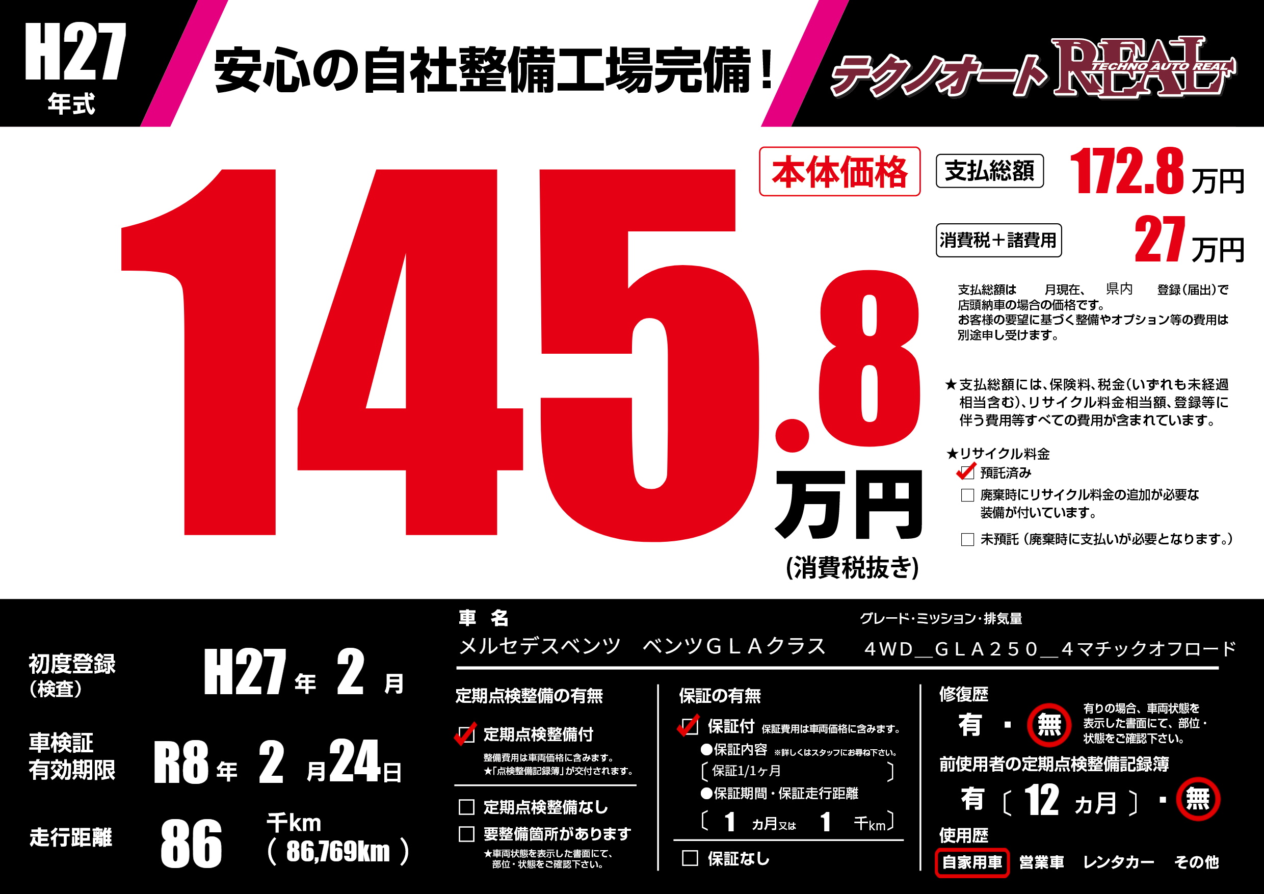 | 走行キロ | 8.6万km | 初年度登録 | H27年2月 |