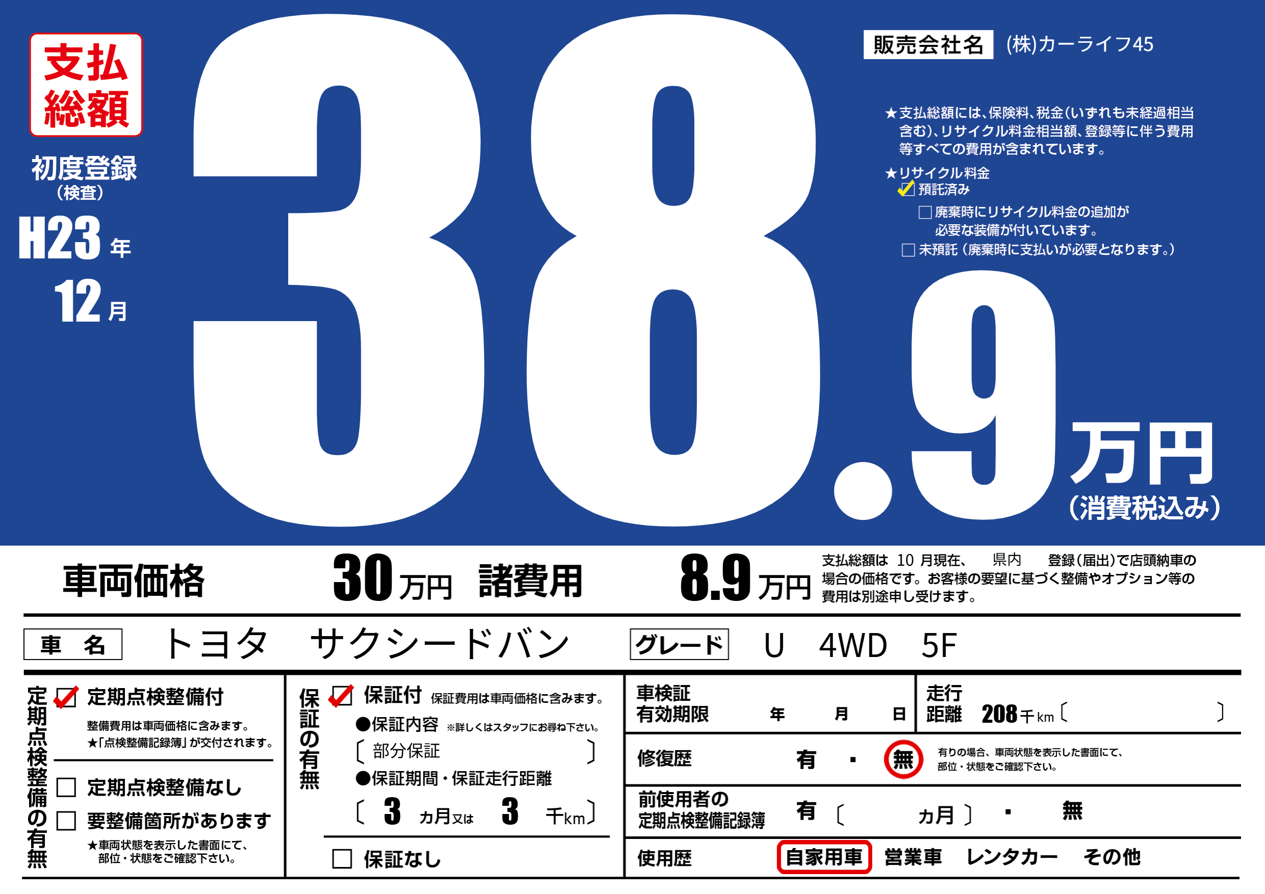 | 走行キロ | 20.8万km | 初年度登録 | H23年12月 |