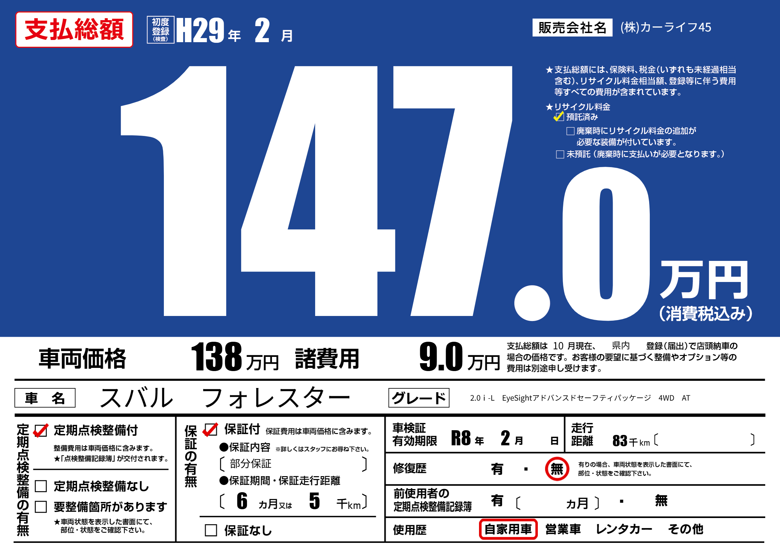 | 車名 | スバル フォレスター | グレード ミッション 排気量 |