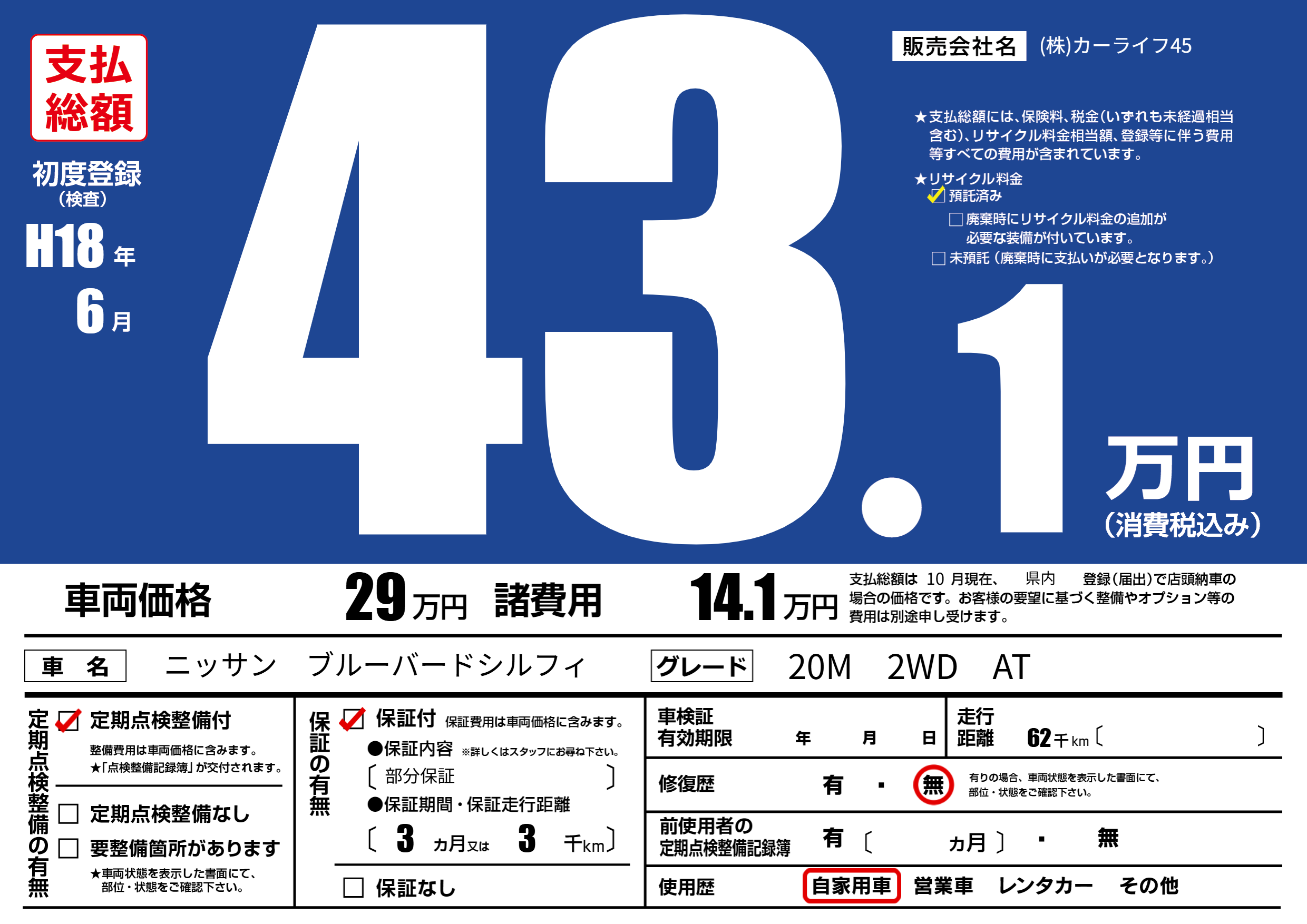 | 車名 | ニッサン ブルーバードシルフィ | グレード ミッション 排気量 |