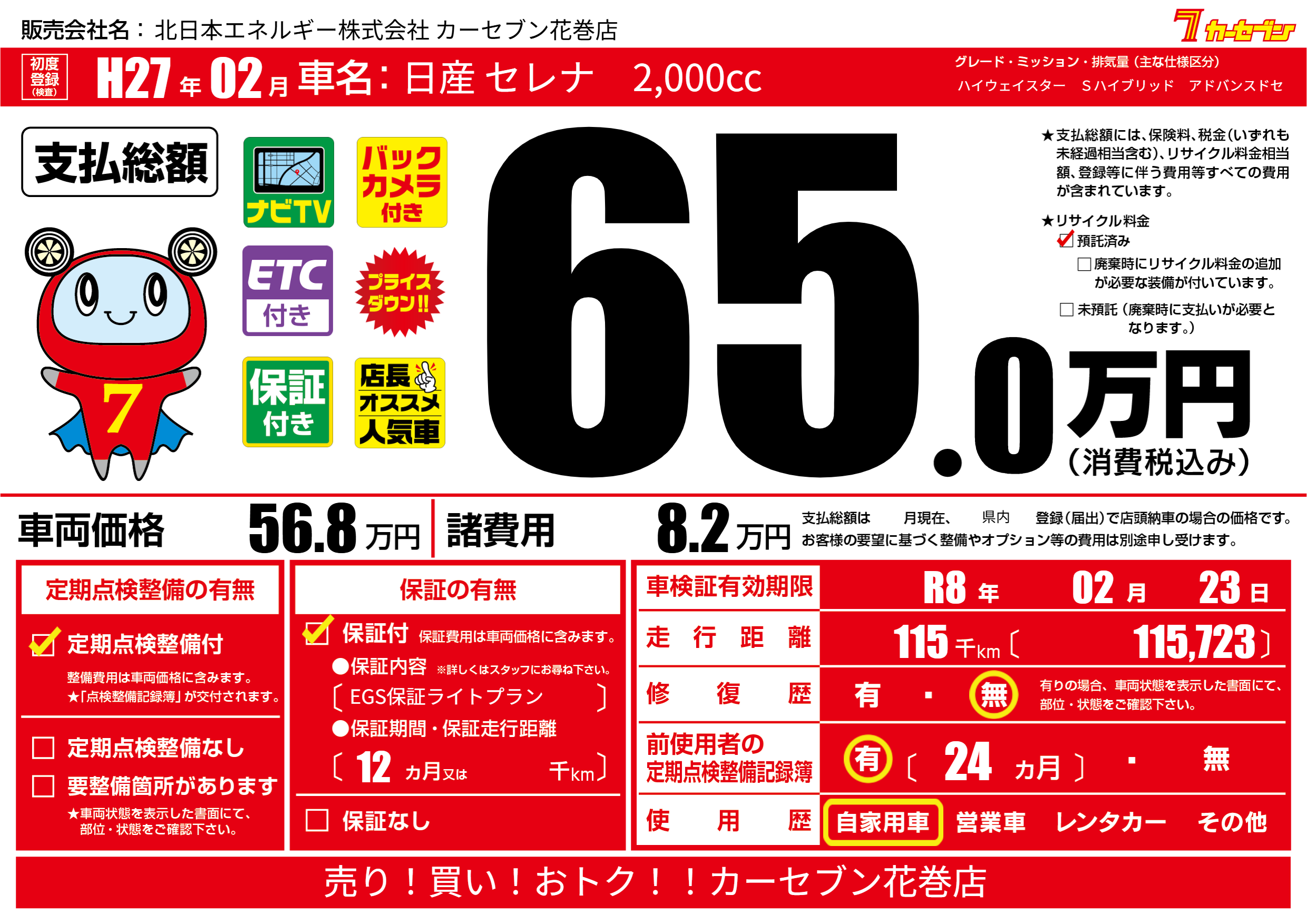 | 走行キロ | 11.5万km | 初年度登録 | H27年02月 |