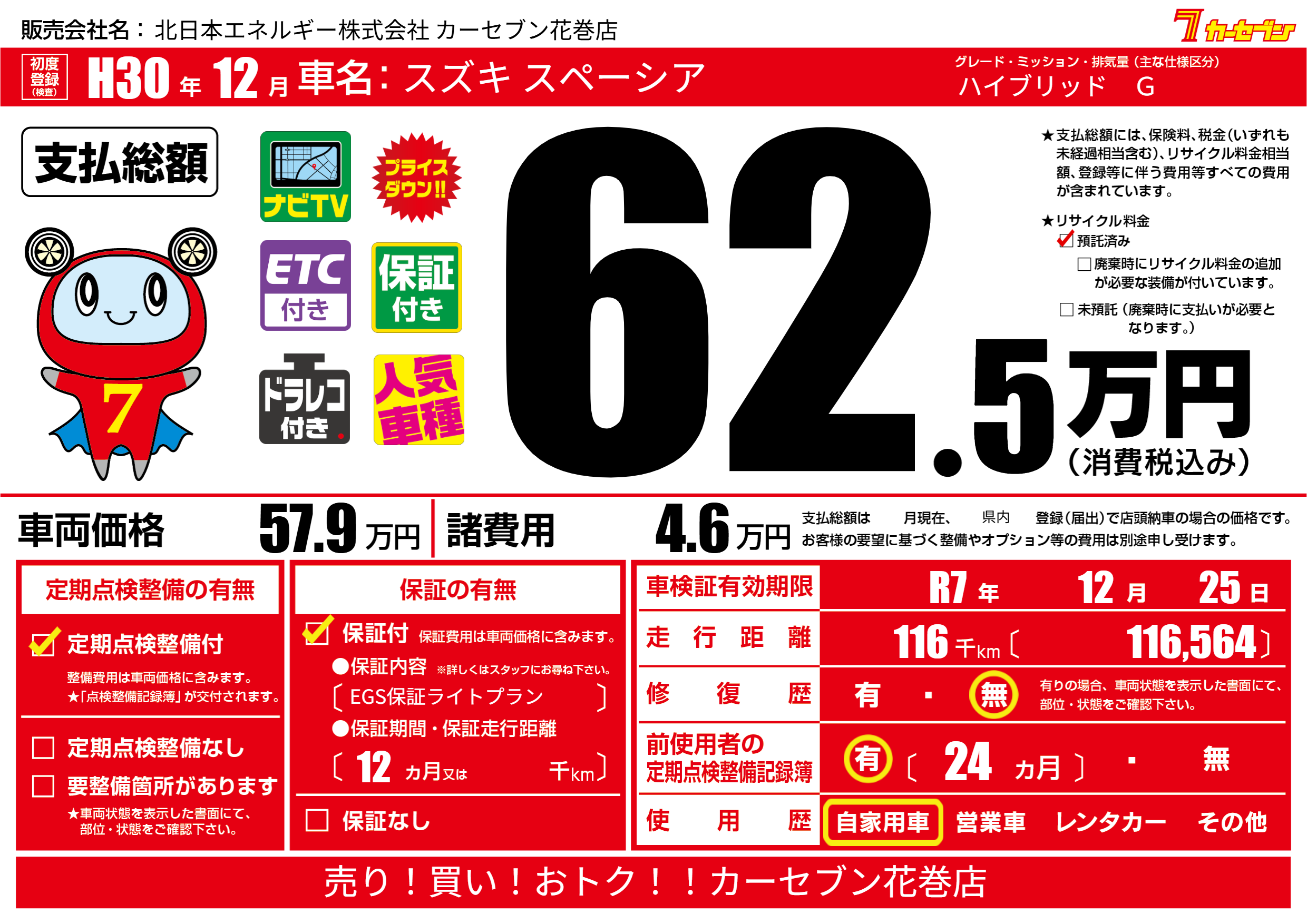 | 走行キロ | 11.6万km | 初年度登録 | H30年12月 |