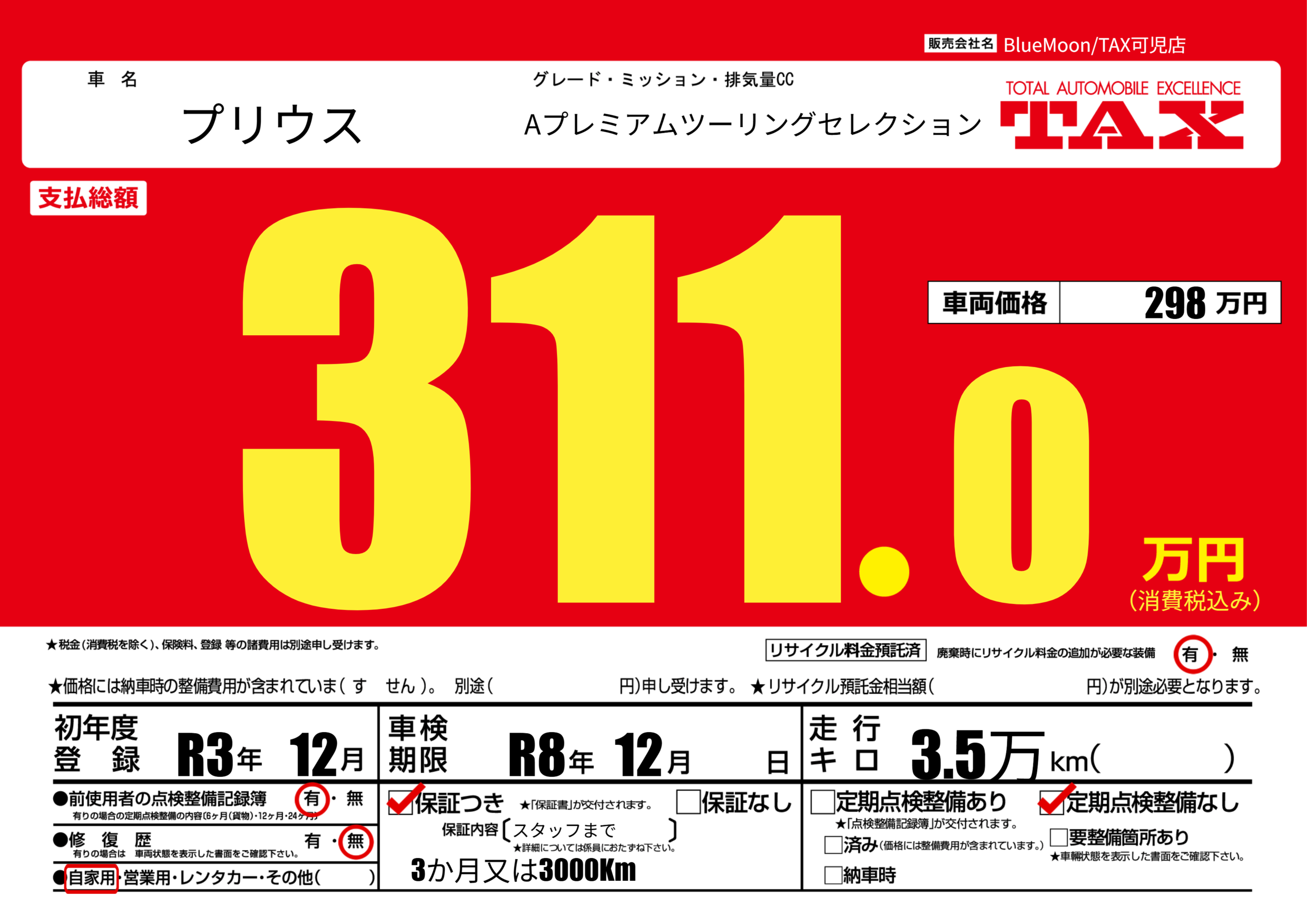 | 車名 | プリウス | グレード ミッション 排気量 |