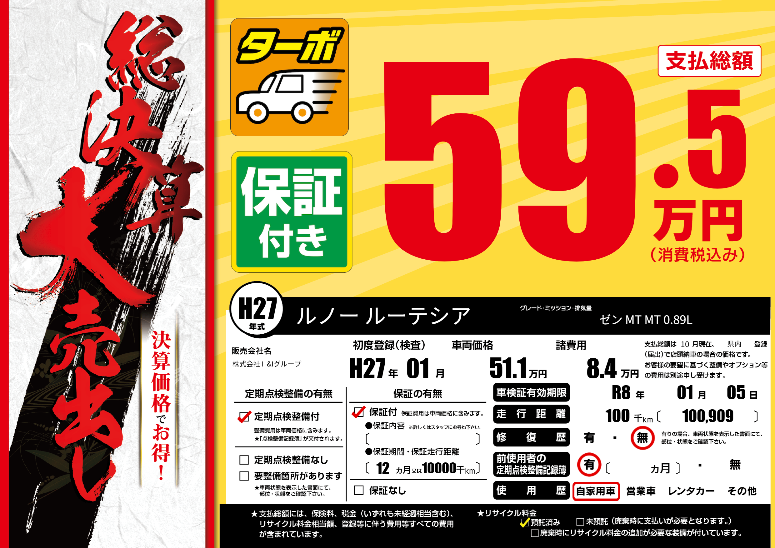保証付き 保証内容(---) 12ヶ月または(10000)千kmまで |