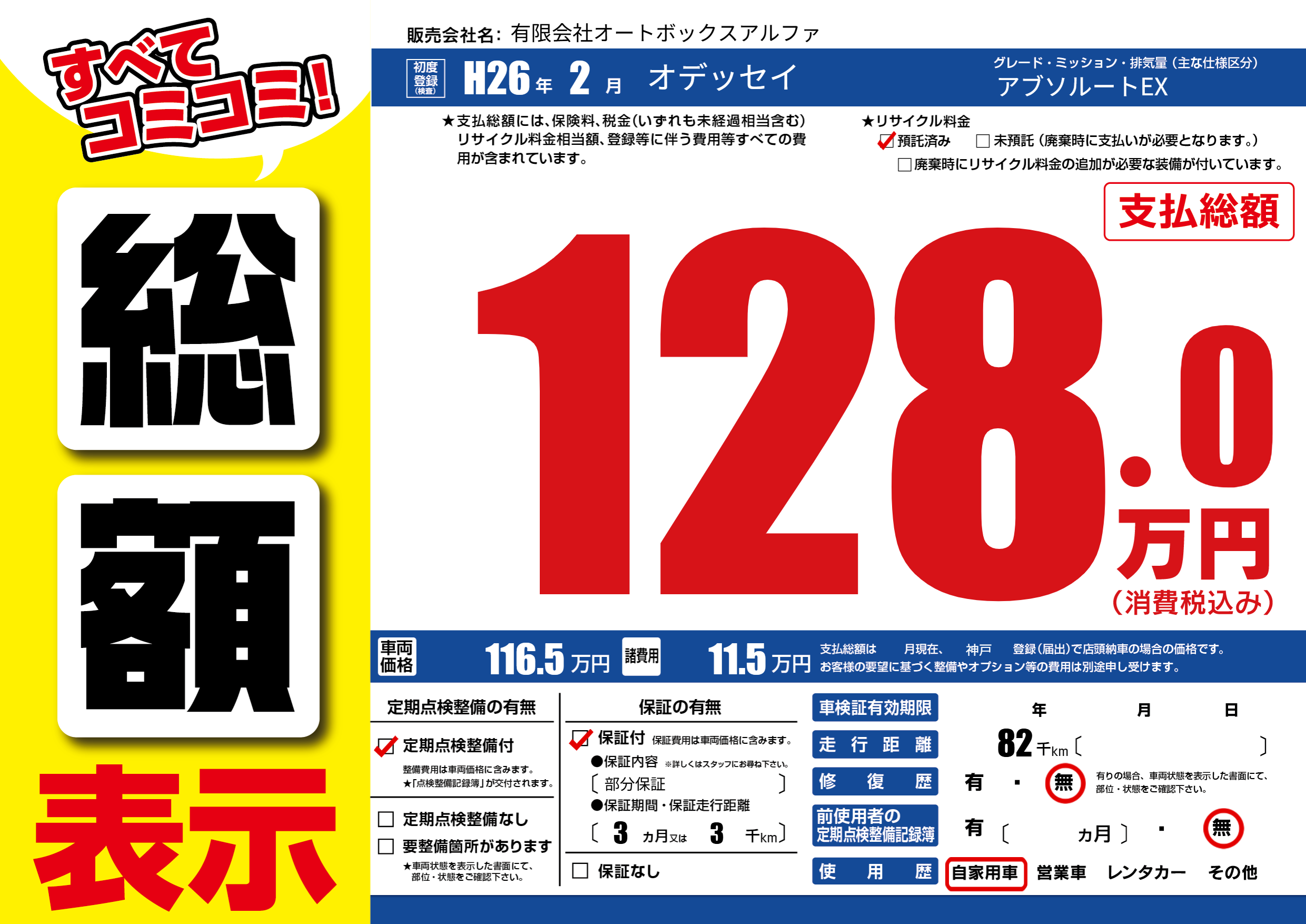 | 車名 | オデッセイ | グレード ミッション 排気量 |