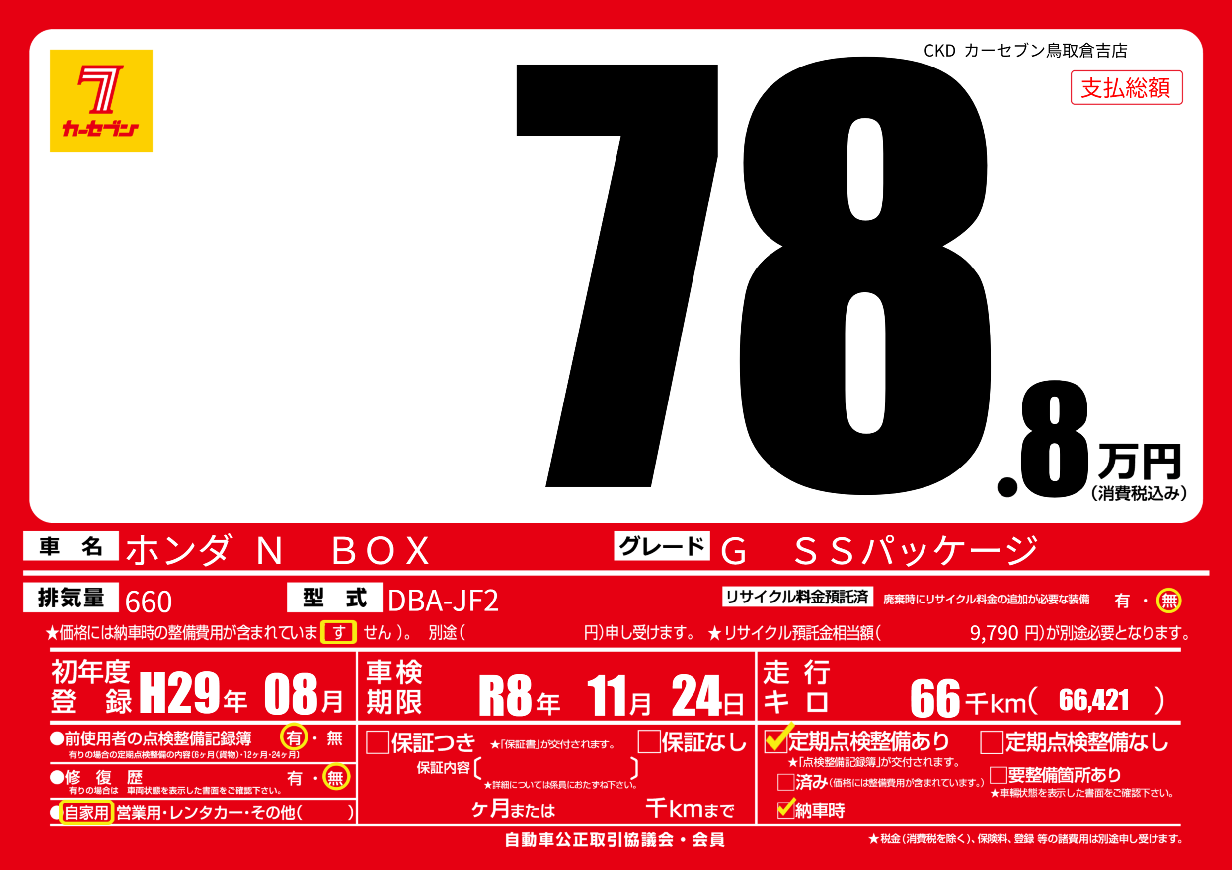 | 走行キロ | 6.6万km | 初年度登録 | H29年08月 |