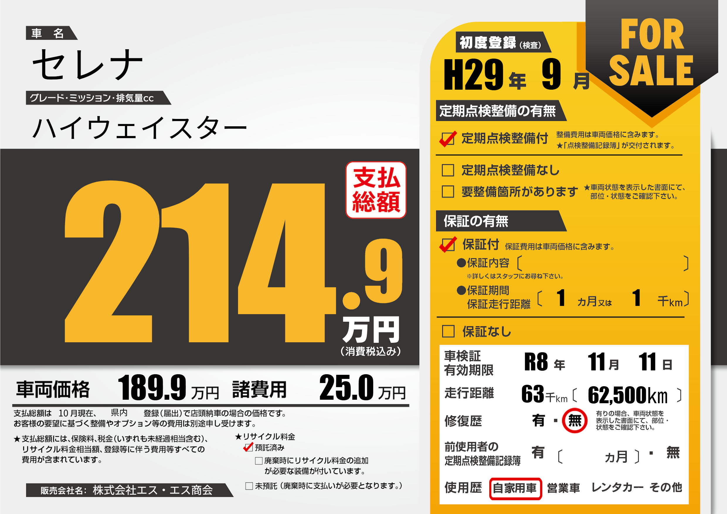 | 走行キロ | 6.3万km | 初年度登録 | H29年9月 |
