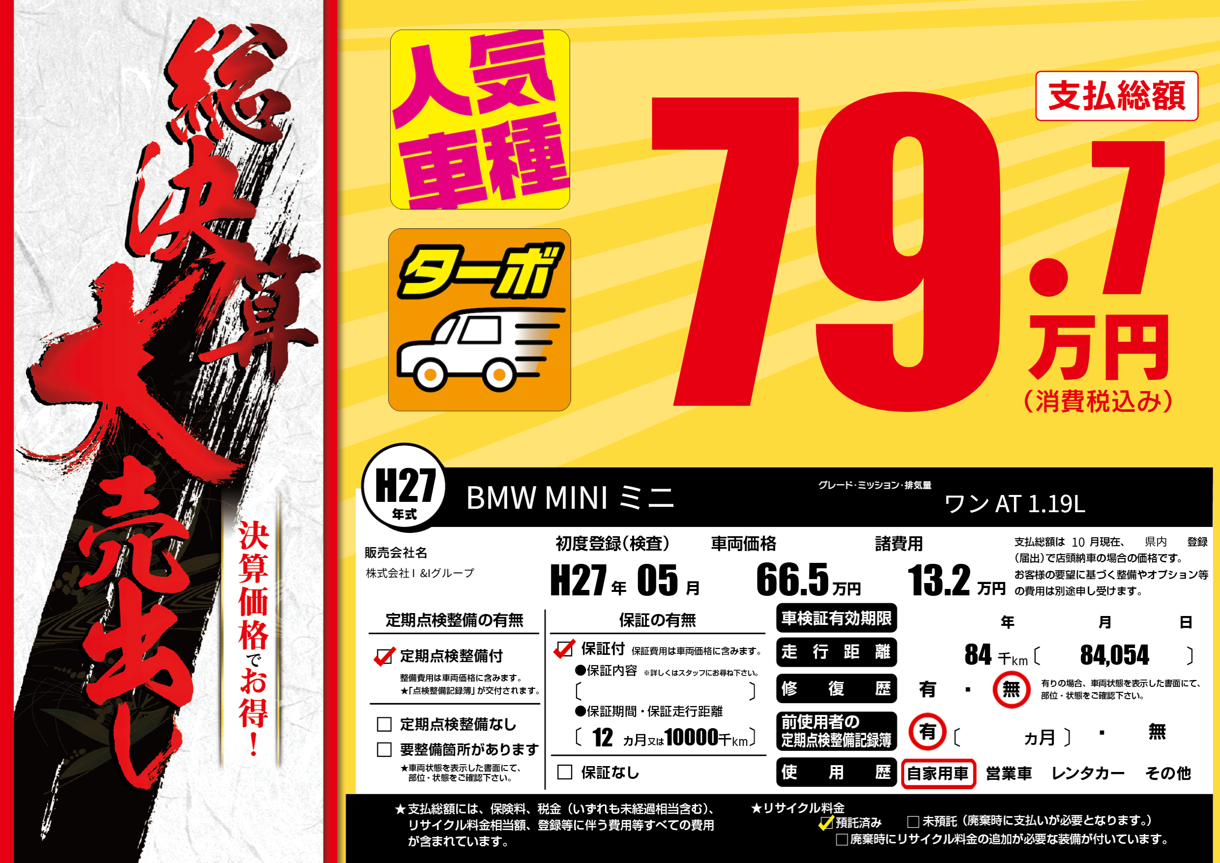 | 車名 | BMW MINI ミニ | グレード ミッション 排気量 |