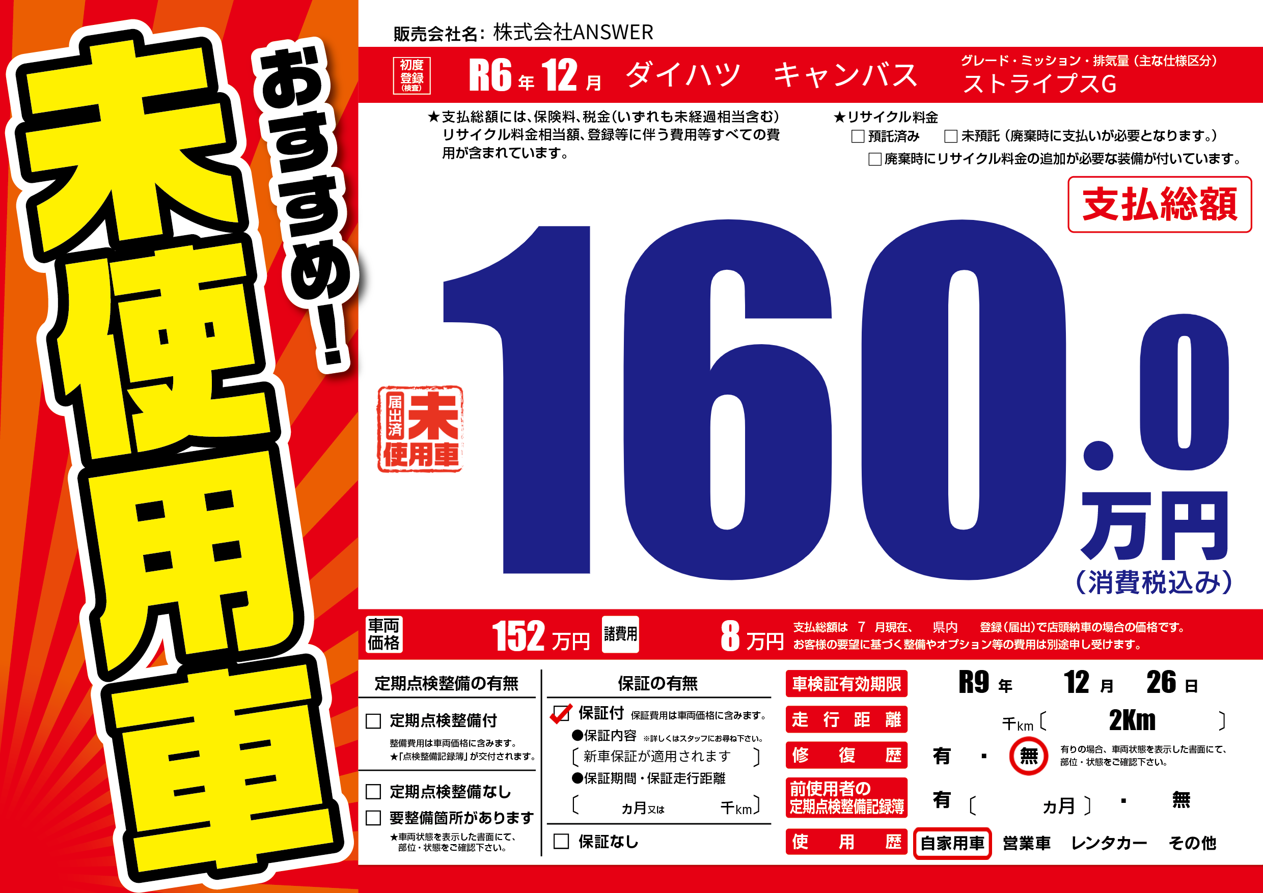 保証付き 保証内容(新車保証が適用されます) ---ヶ月または()千kmまで |