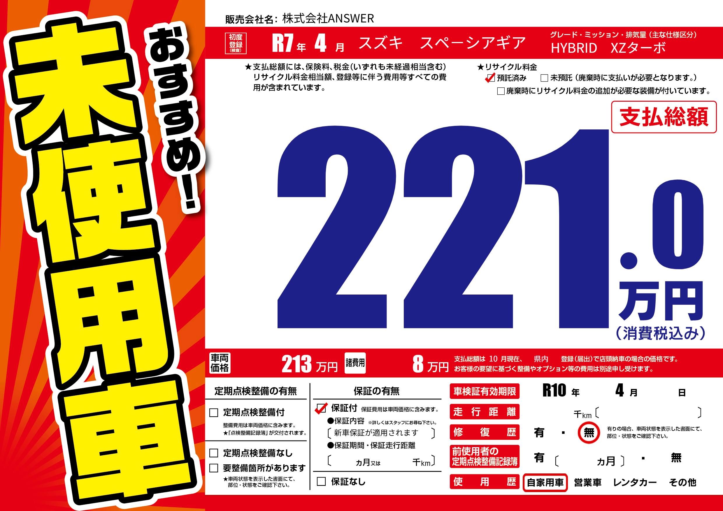 保証付き 保証内容(新車保証が適用されます) ---ヶ月または()千kmまで |