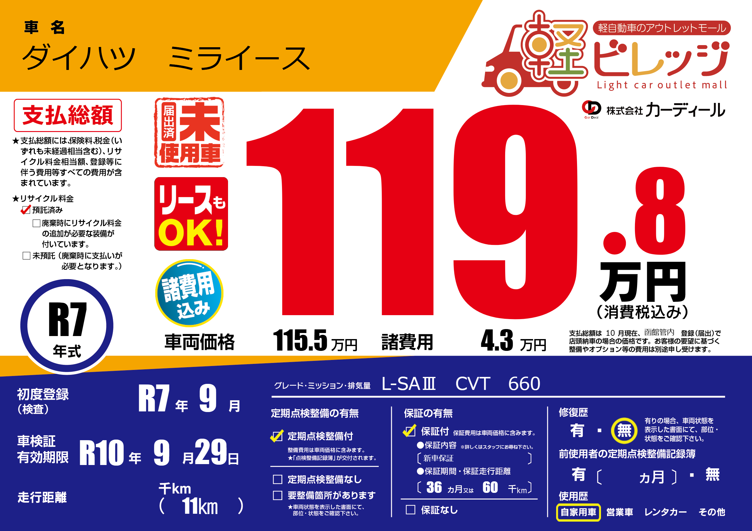 | 走行キロ | - | 初年度登録 | R7年9月 |