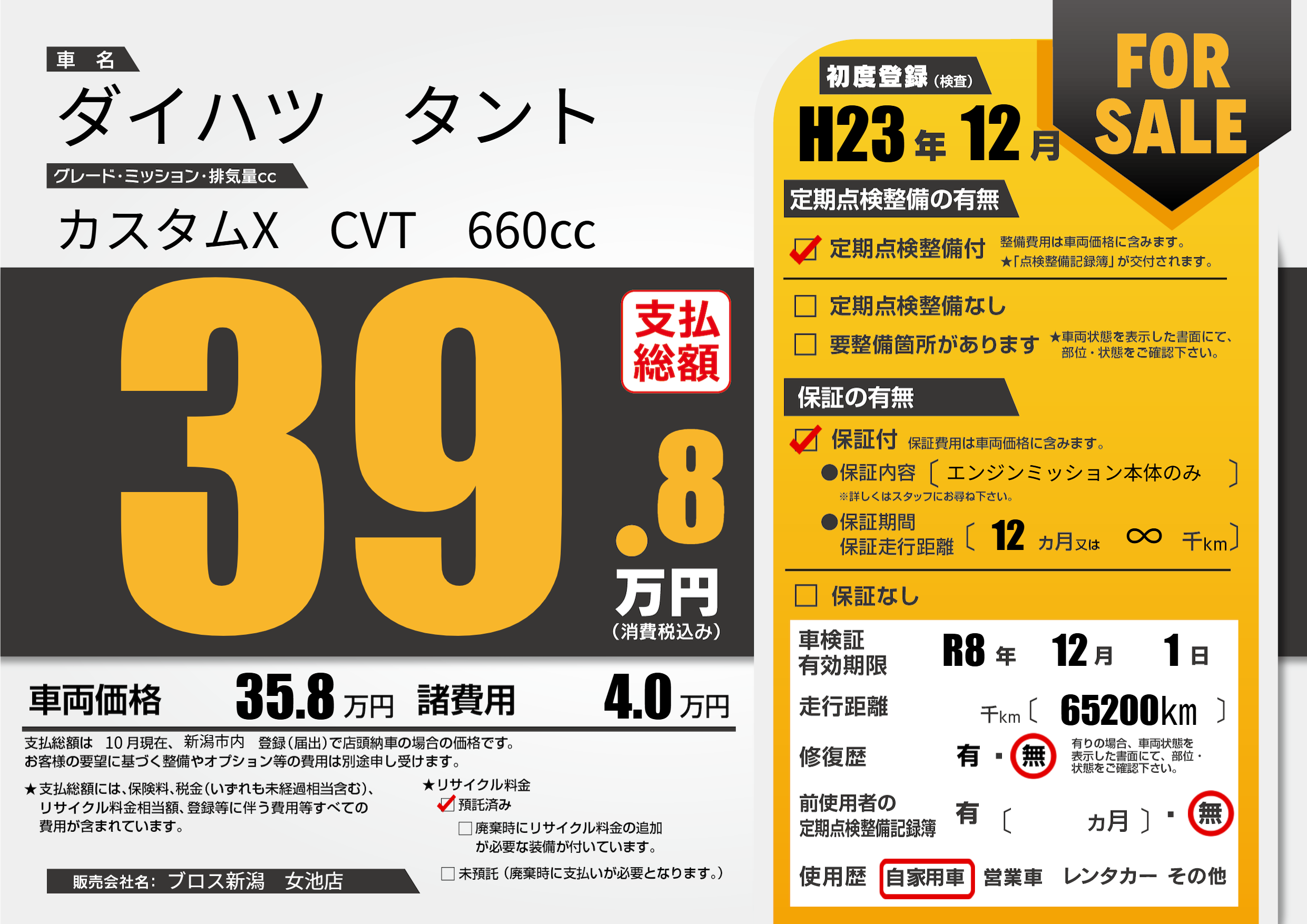 | 車名 | ダイハツ タント | グレード ミッション 排気量 |