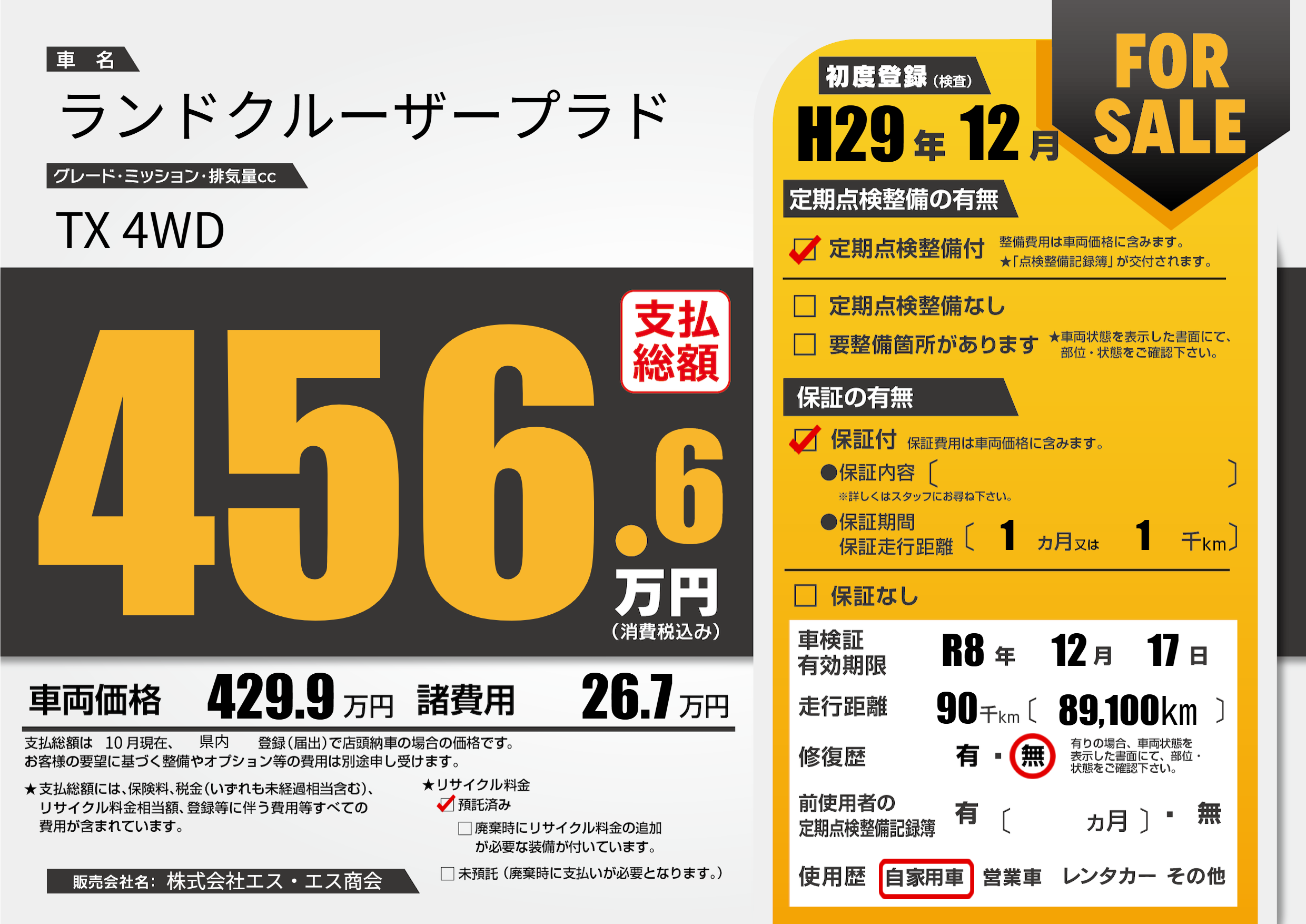 | 走行キロ | 9万km | 初年度登録 | H29年12月 |