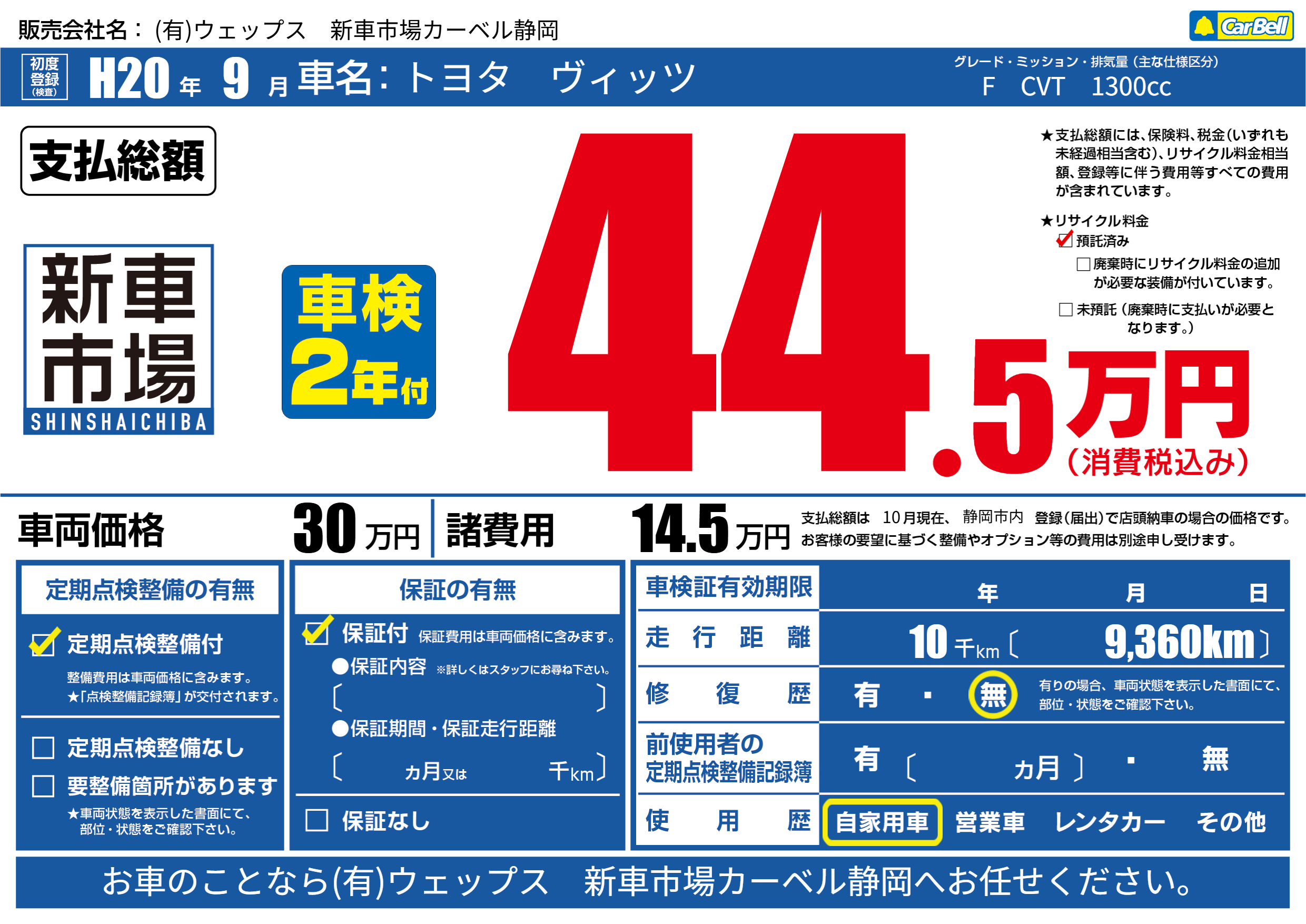 | 車名 | トヨタ ヴィッツ | グレード ミッション 排気量 |