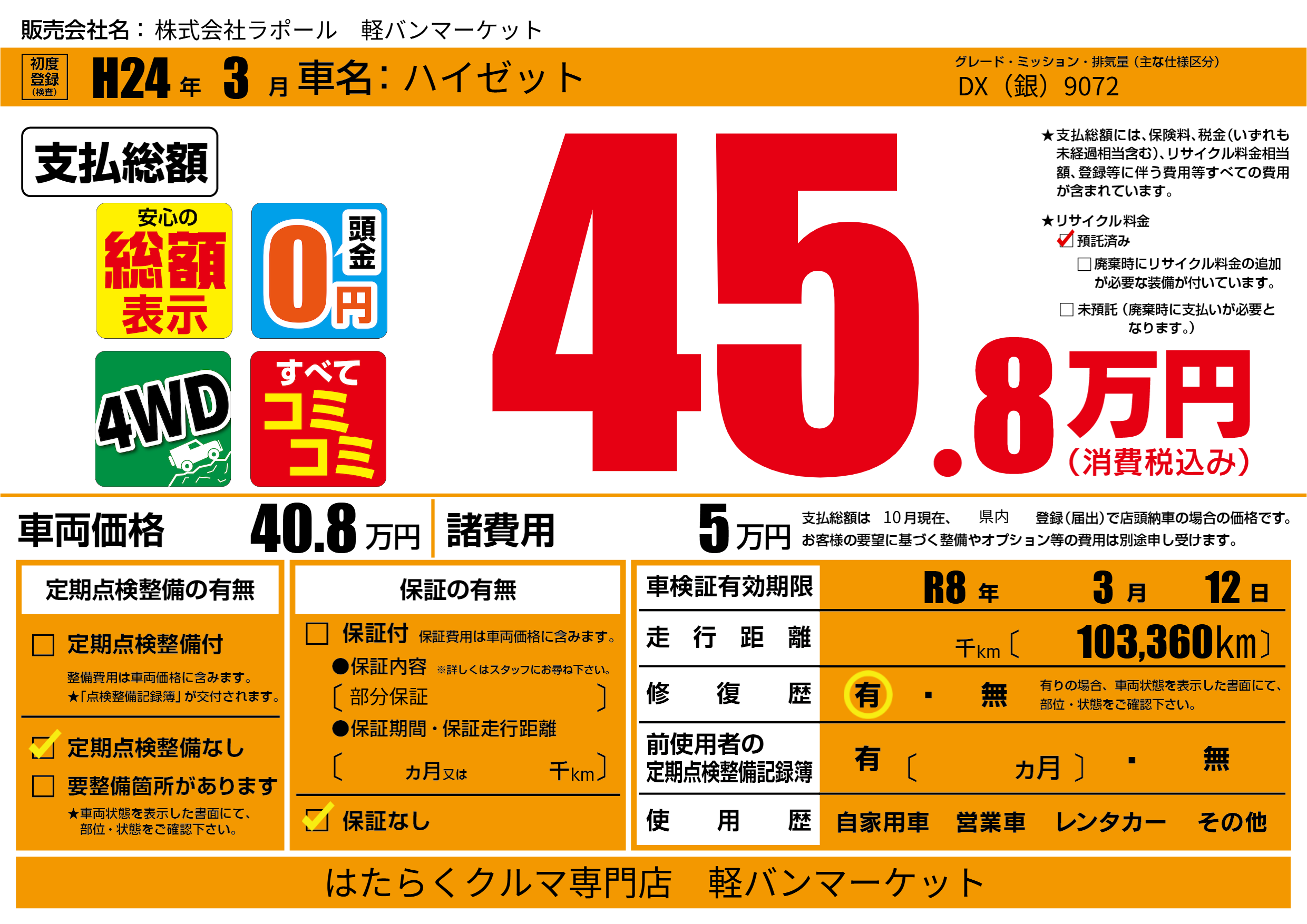 | 車検制限 | R8年 3月 12日 | ||