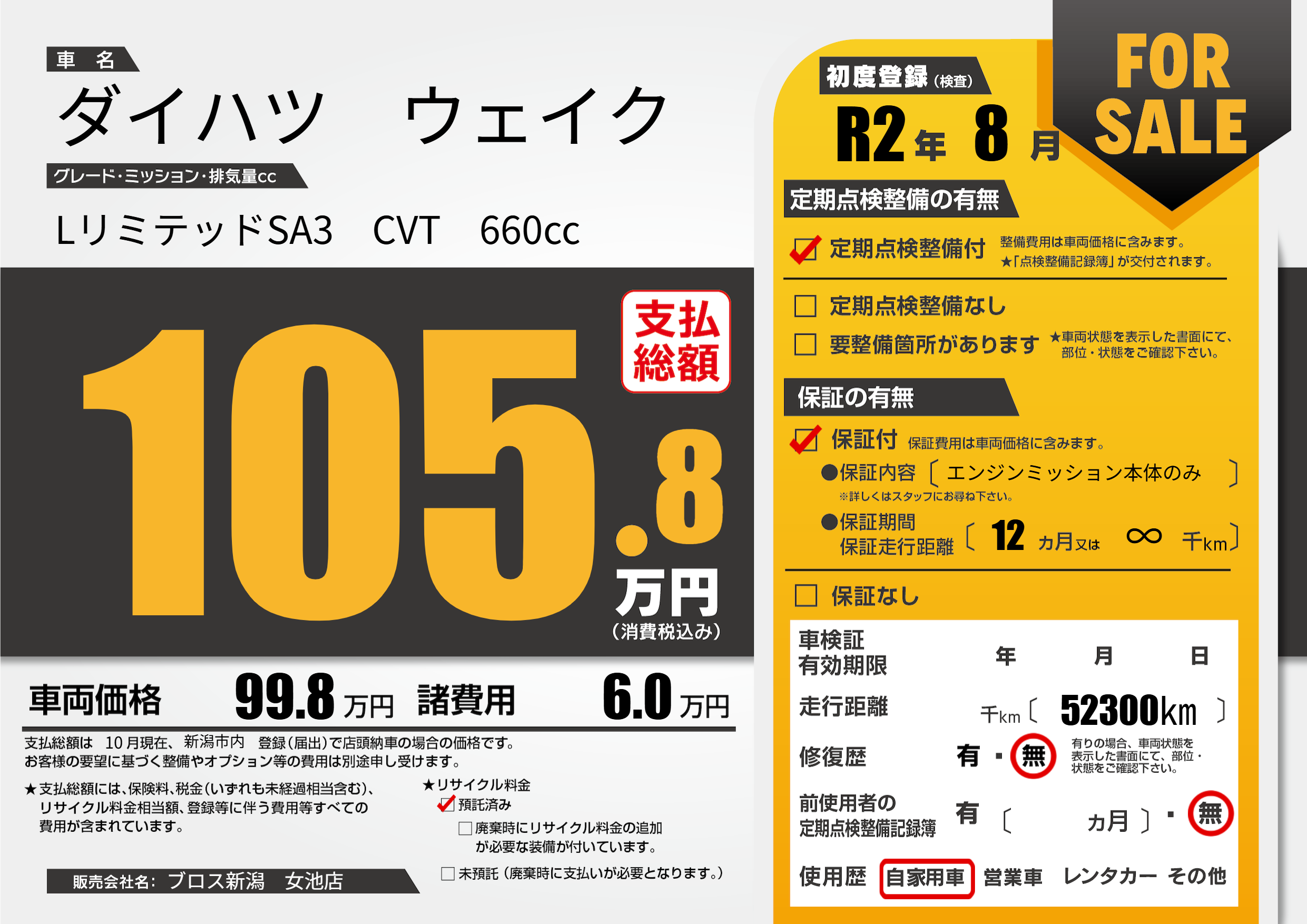| 走行キロ | - | 初年度登録 | R2年8月 |