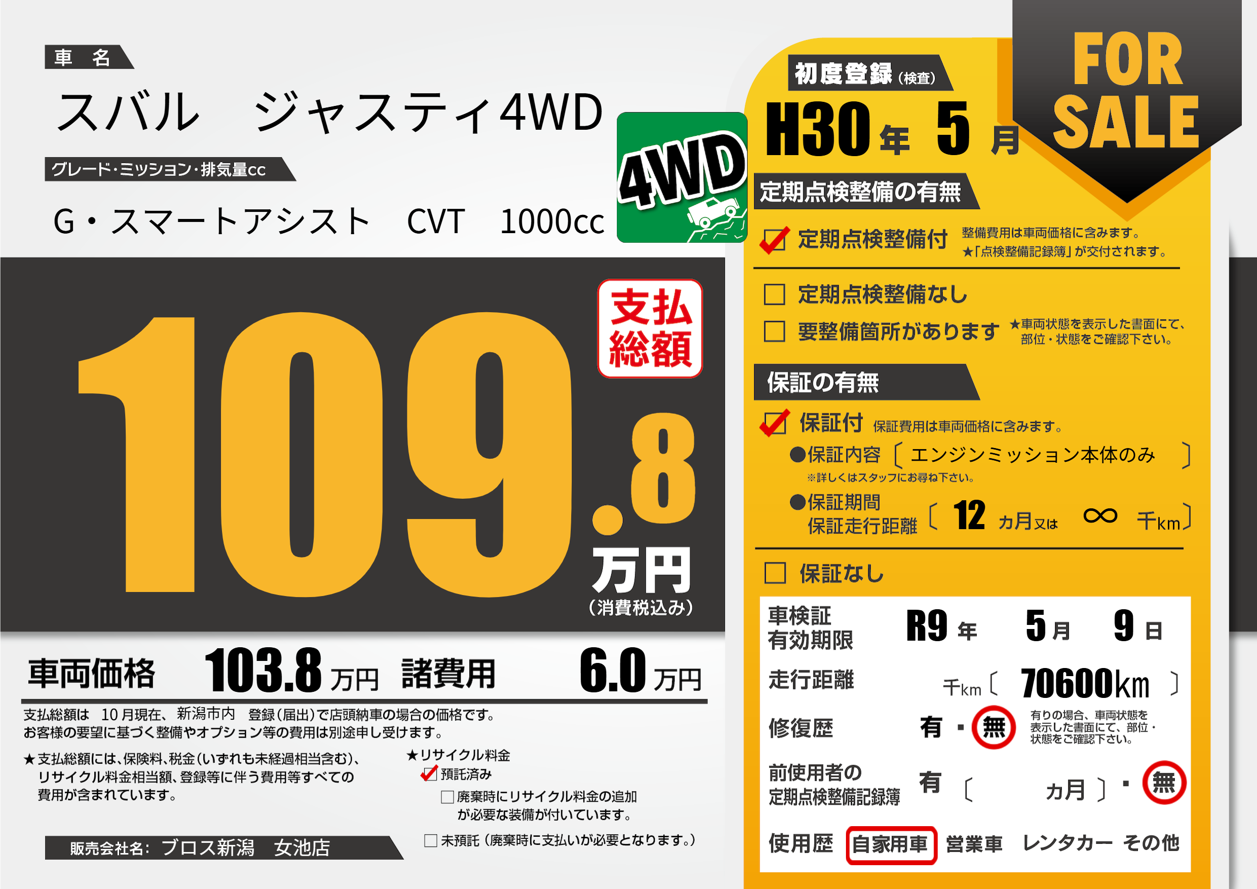 | 車名 | スバル ジャスティ4WD | グレード ミッション 排気量 |