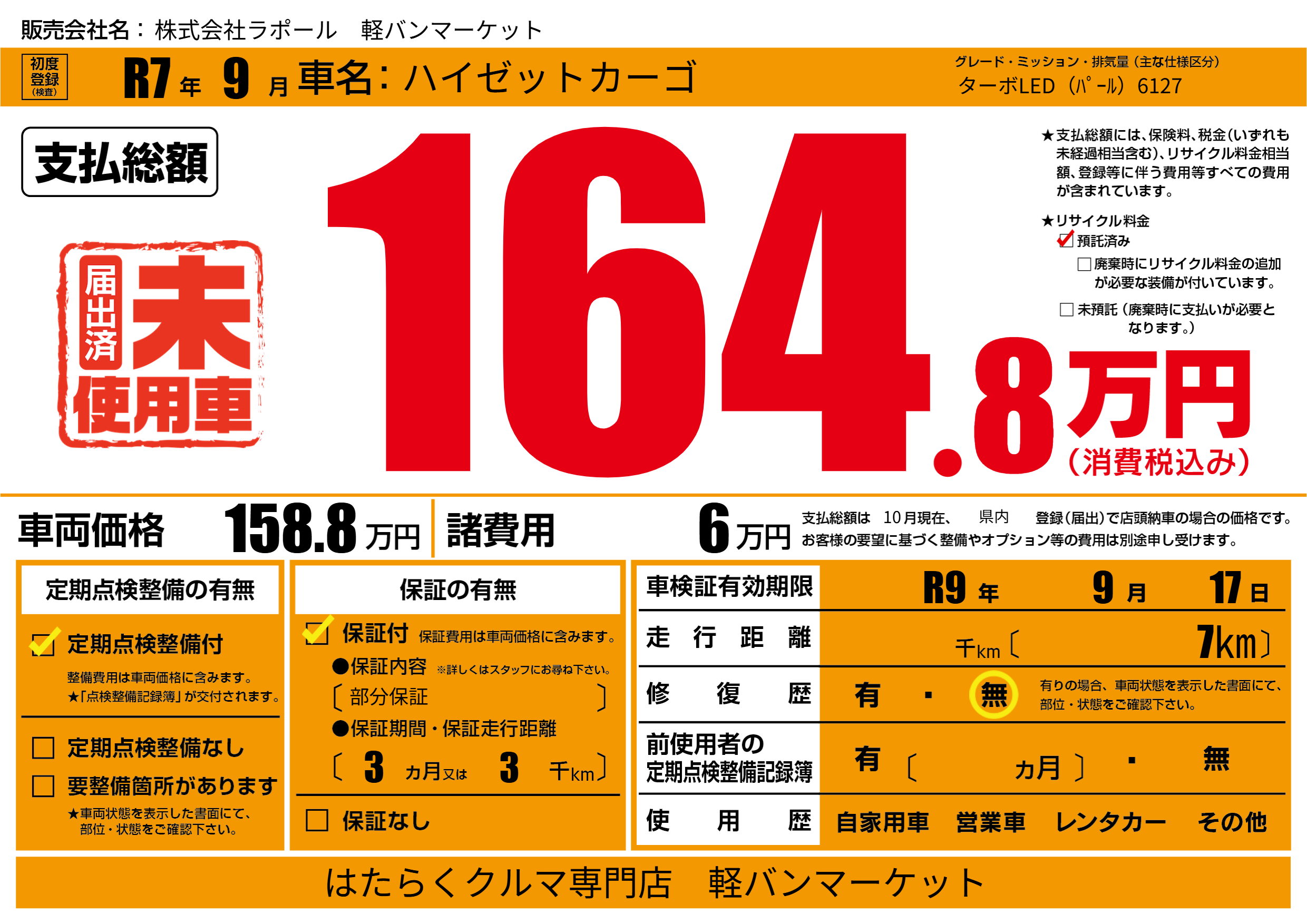 | 走行キロ | - | 初年度登録 | R7年9月 |