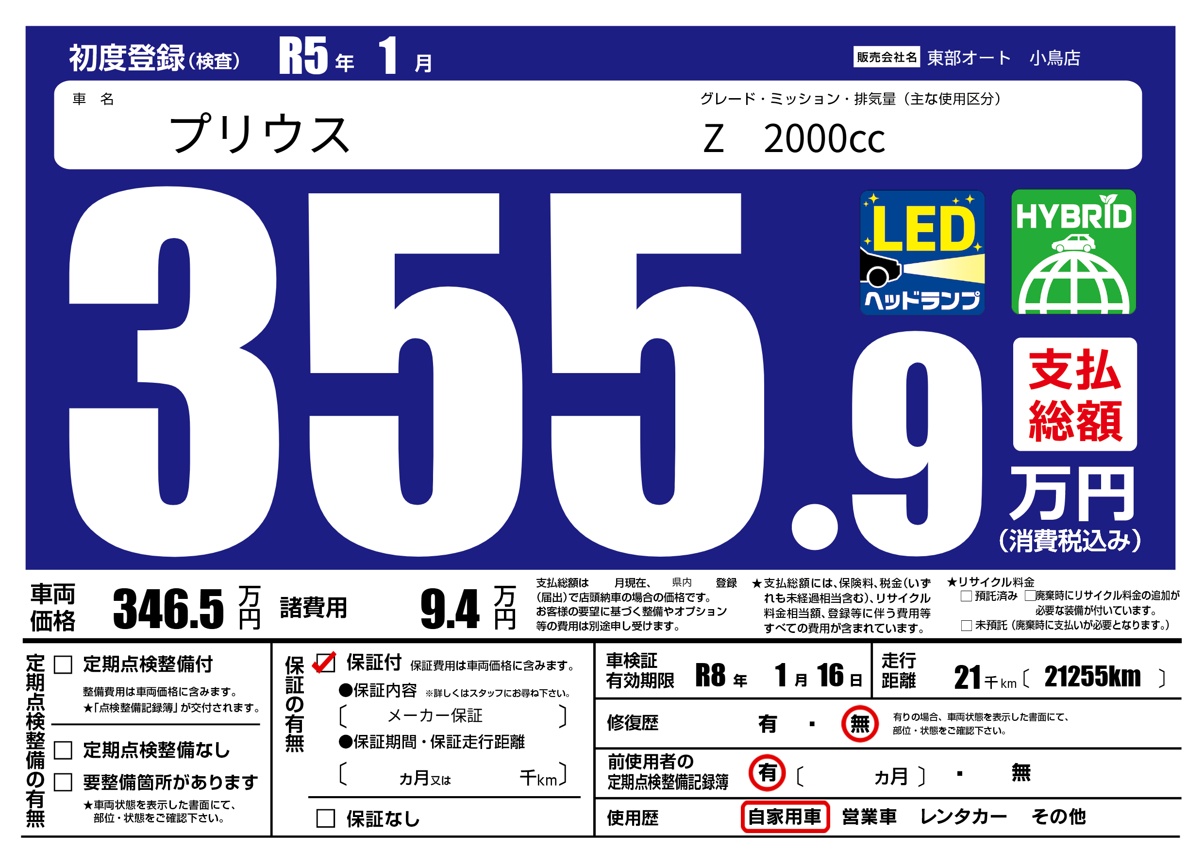 | 車名 | プリウス | グレード ミッション 排気量 |