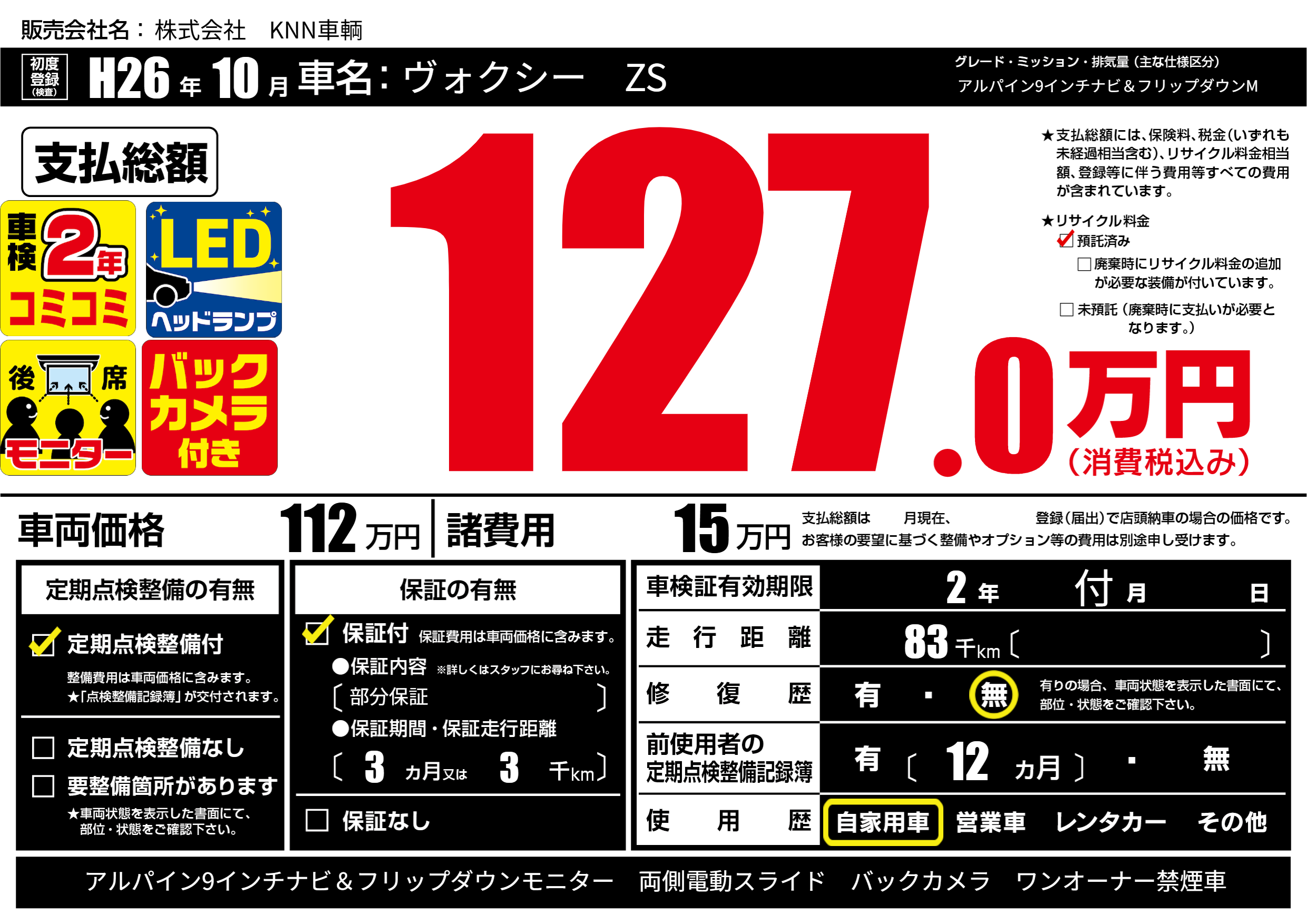 | 走行キロ | 8.3万km | 初年度登録 | H26年10月 |