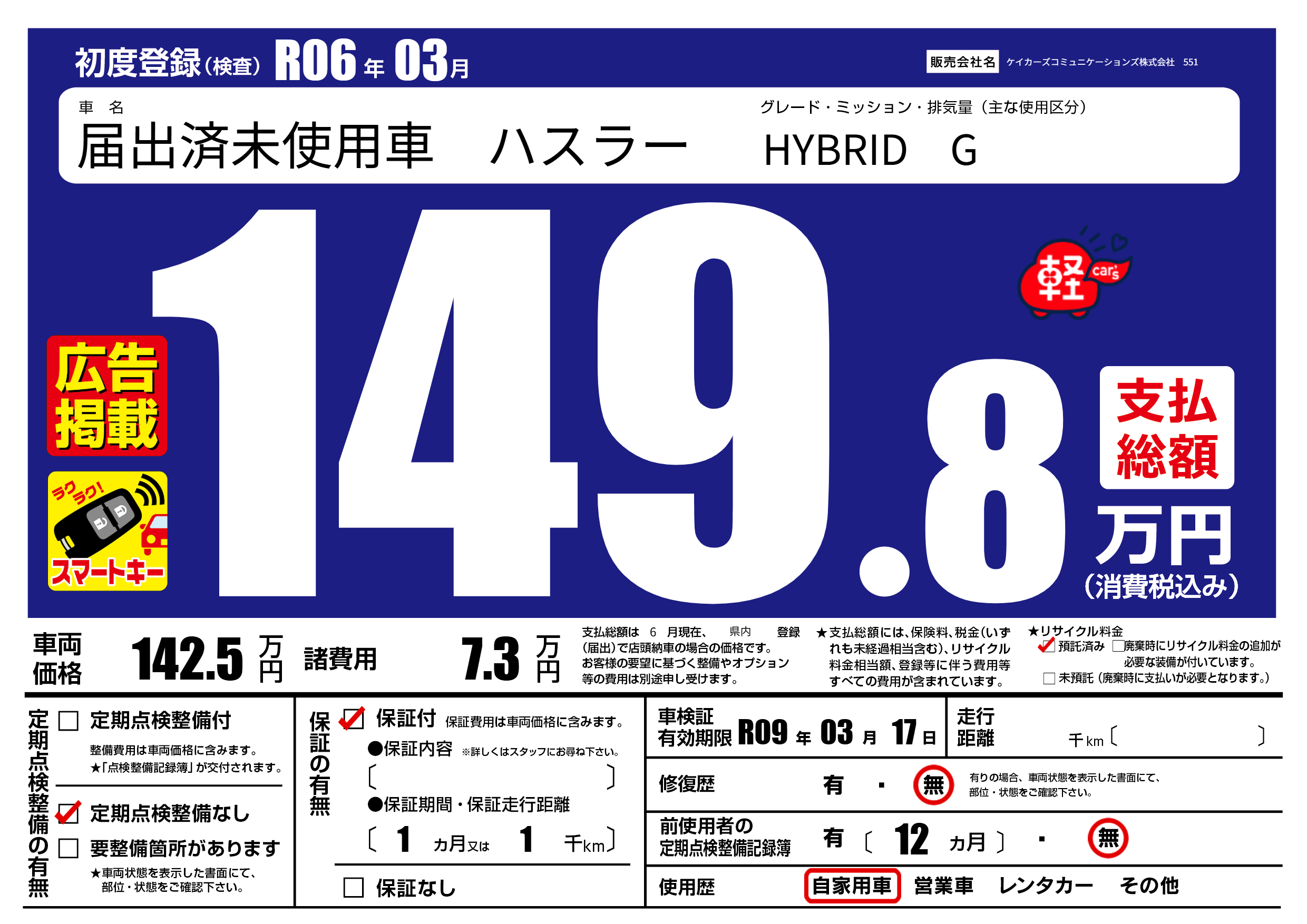 | 車名 | 届出済未使用車 ハスラー | グレード ミッション 排気量 |