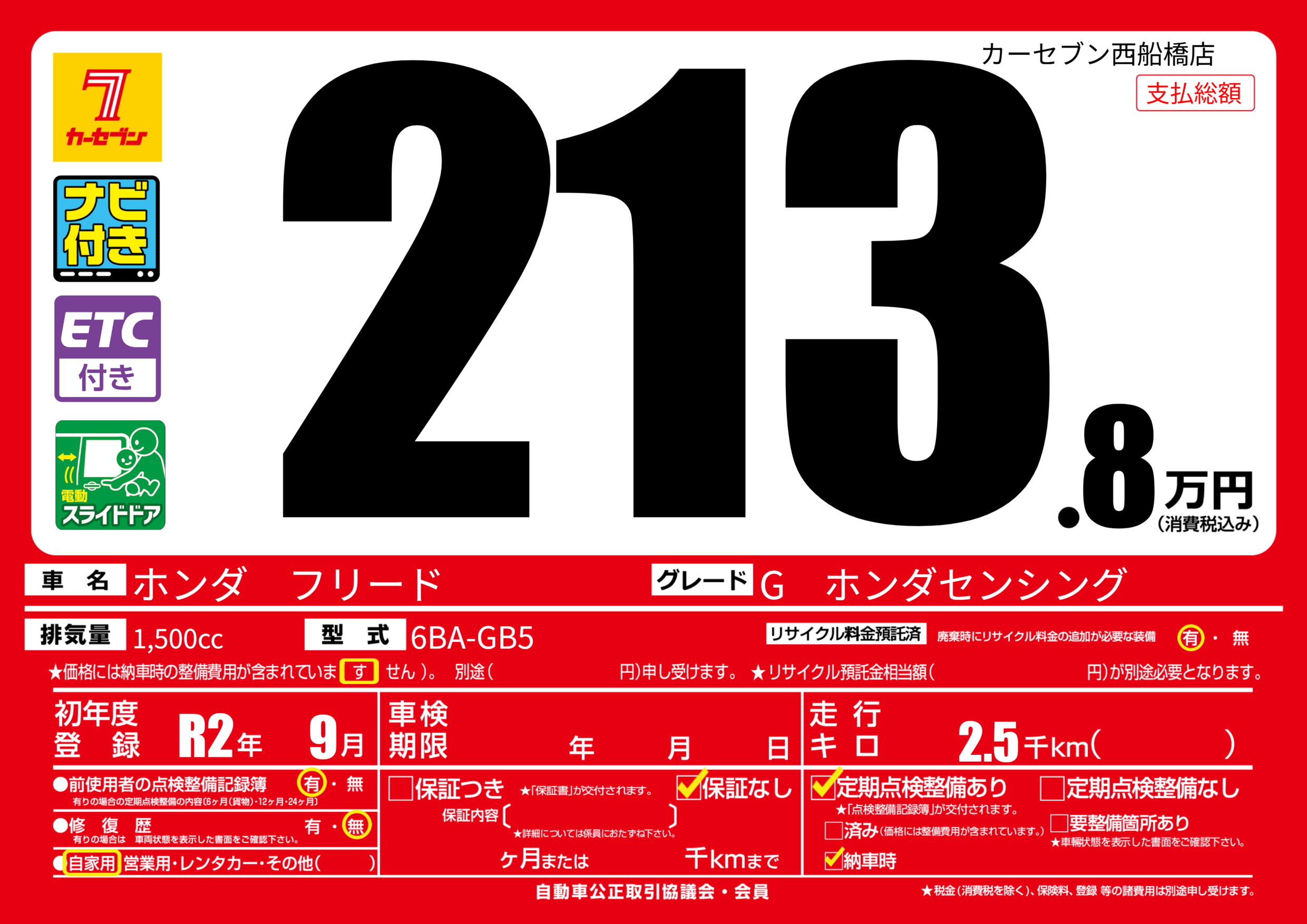 | 車名 | ホンダ フリード | グレード ミッション 排気量 |