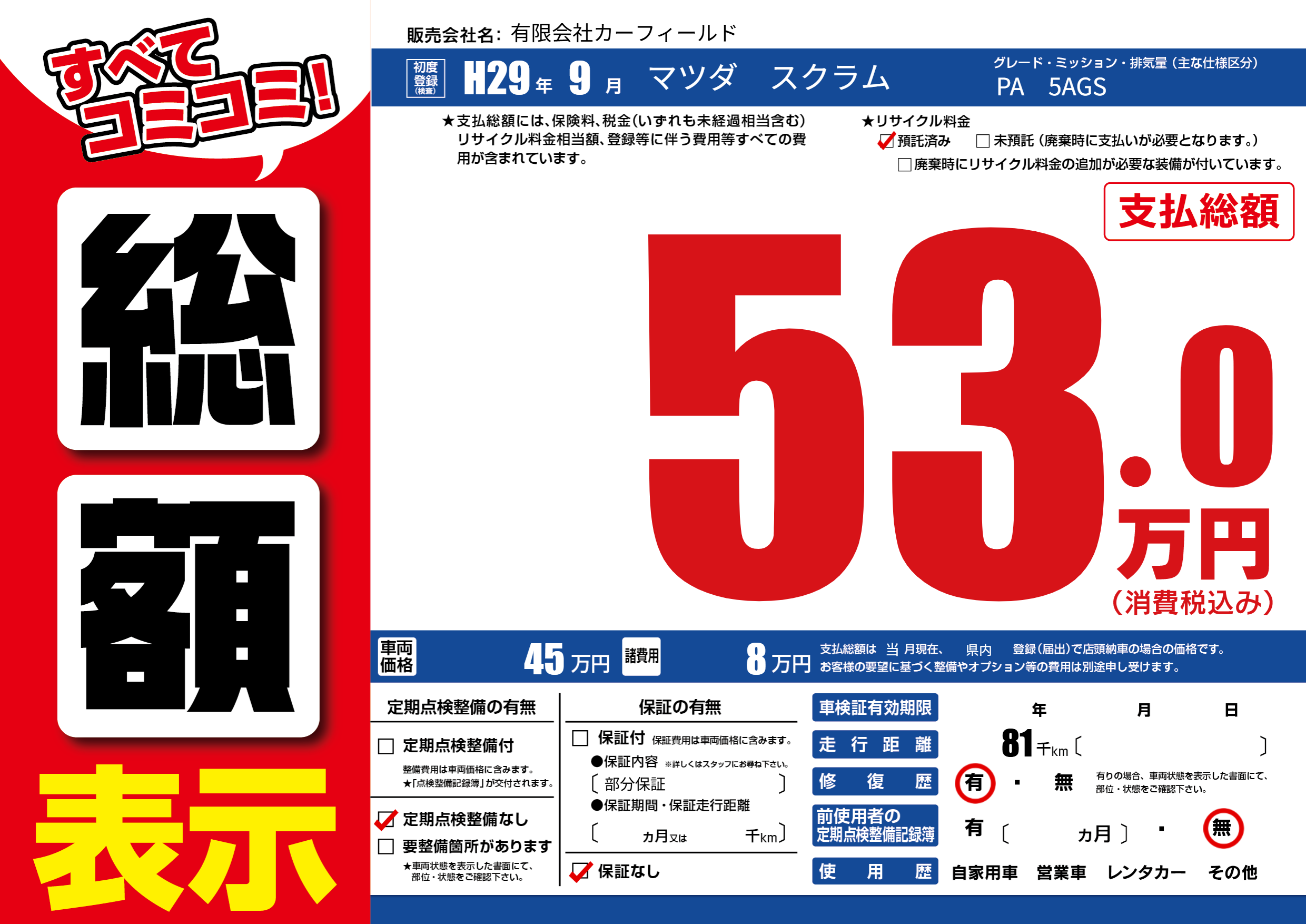 | 車名 | マツダ スクラム | グレード ミッション 排気量 |