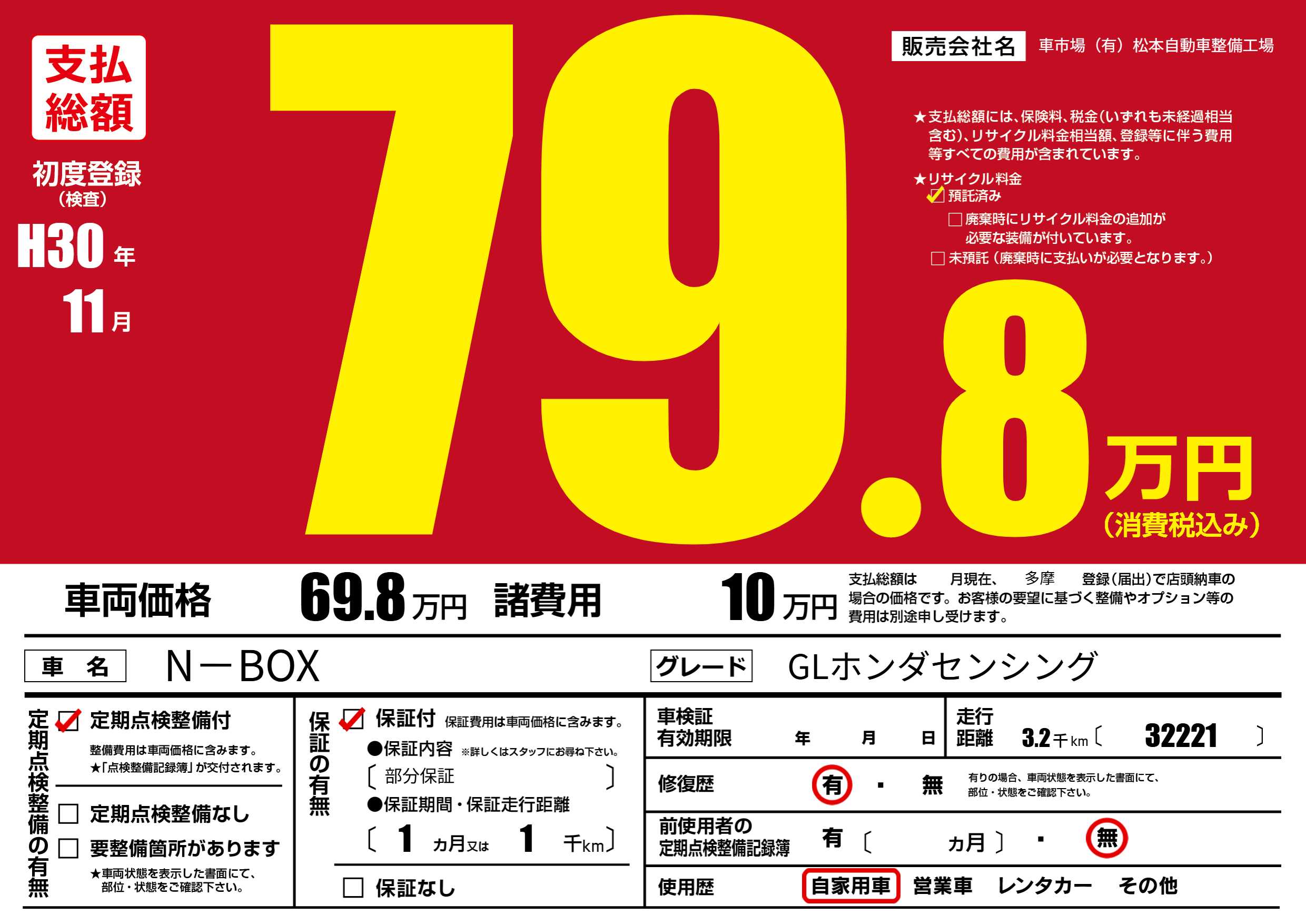 | 走行キロ | 0.3万km | 初年度登録 | H30年11月 |