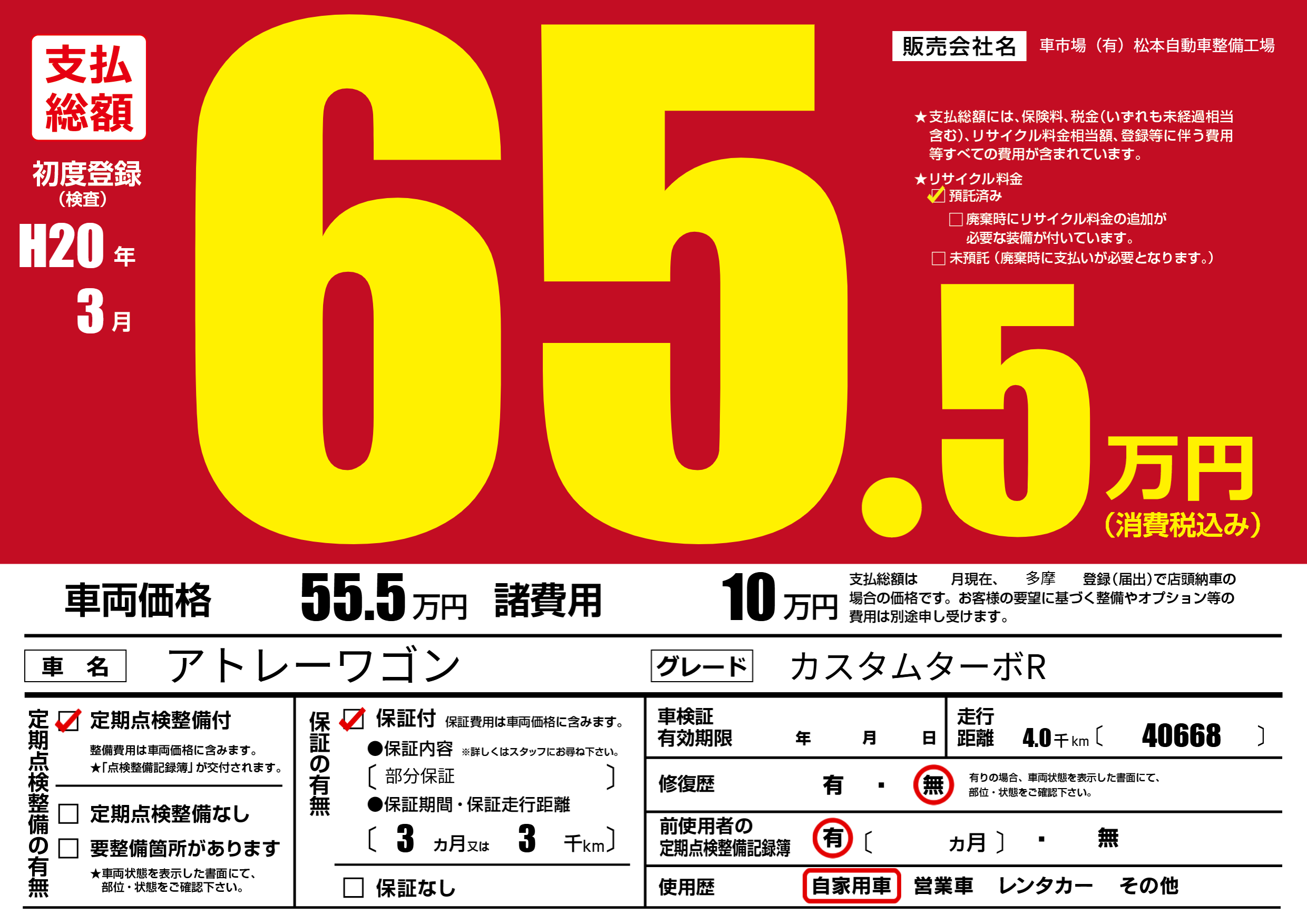| 走行キロ | 0.4万km | 初年度登録 | H20年3月 |