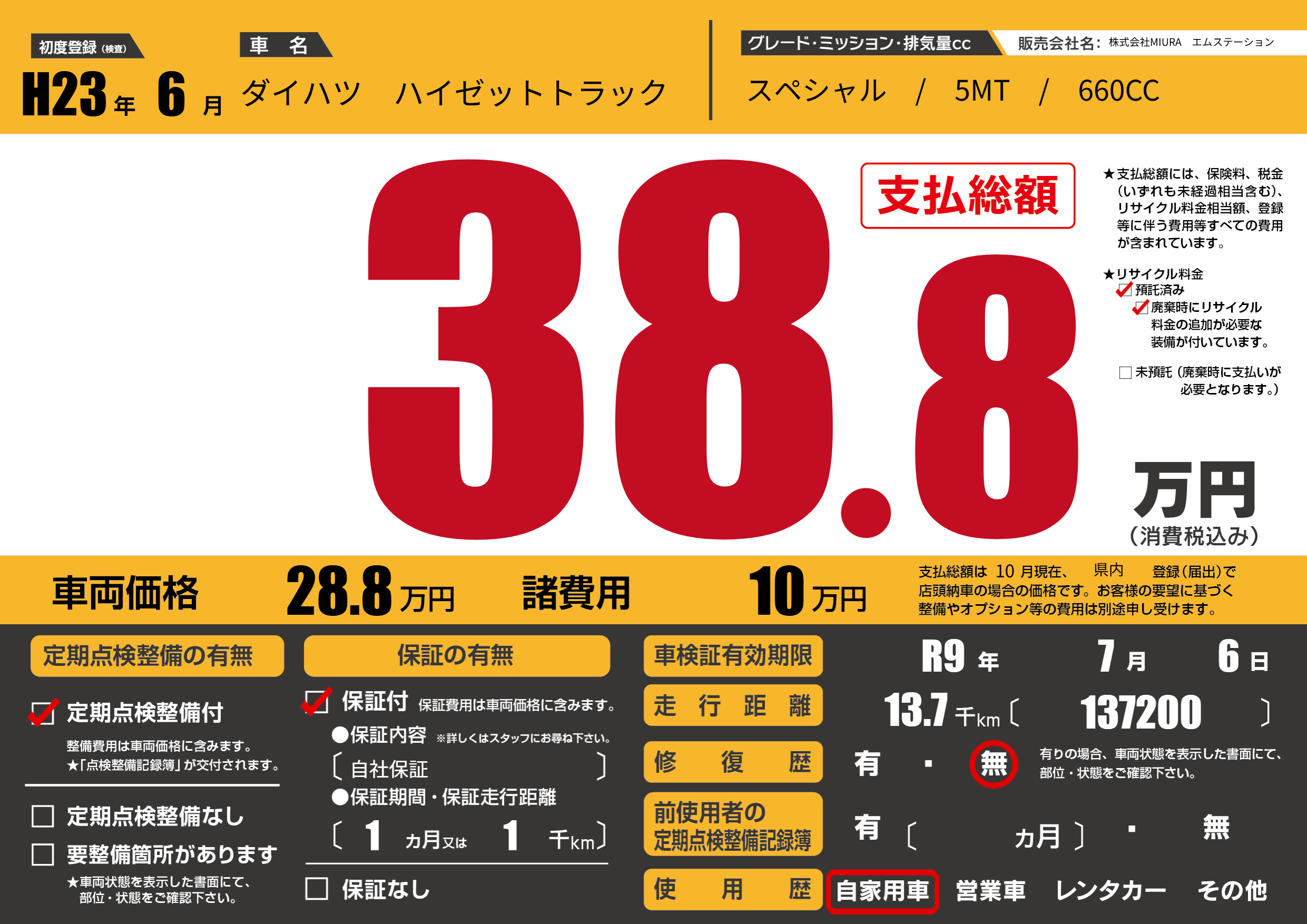 | 車名 | ダイハツ ハイゼットトラック | グレード ミッション 排気量 |