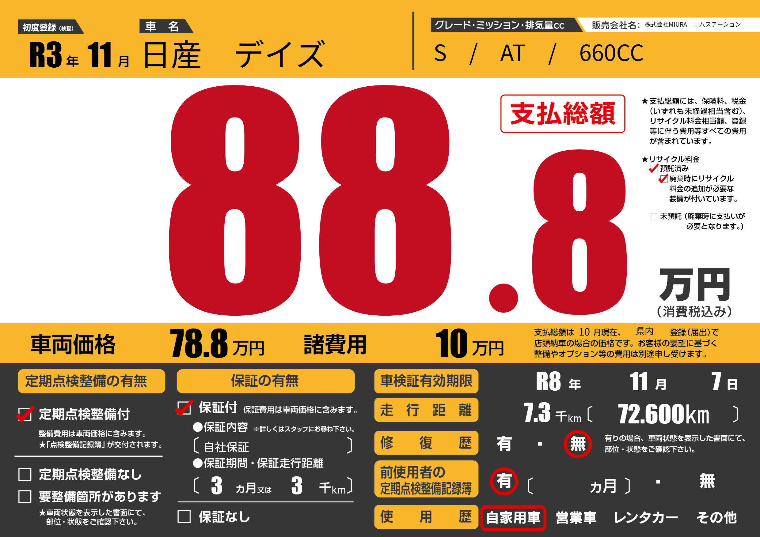| 車名 | 日産 デイズ | グレード ミッション 排気量 |
