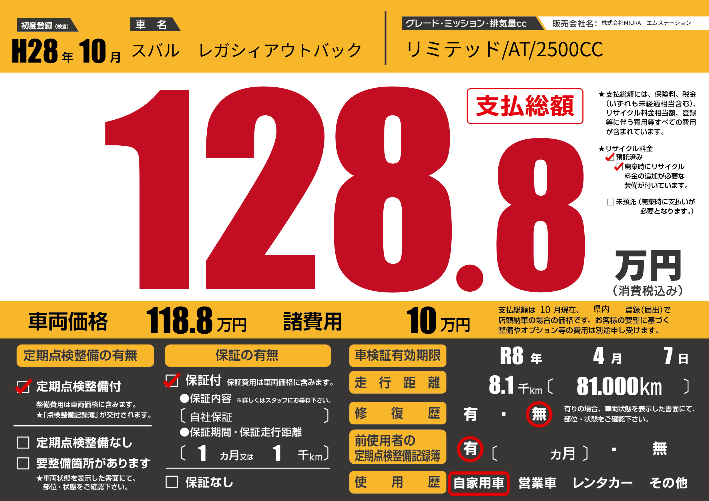| 車名 | スバル レガシィアウトバック | グレード ミッション 排気量 |