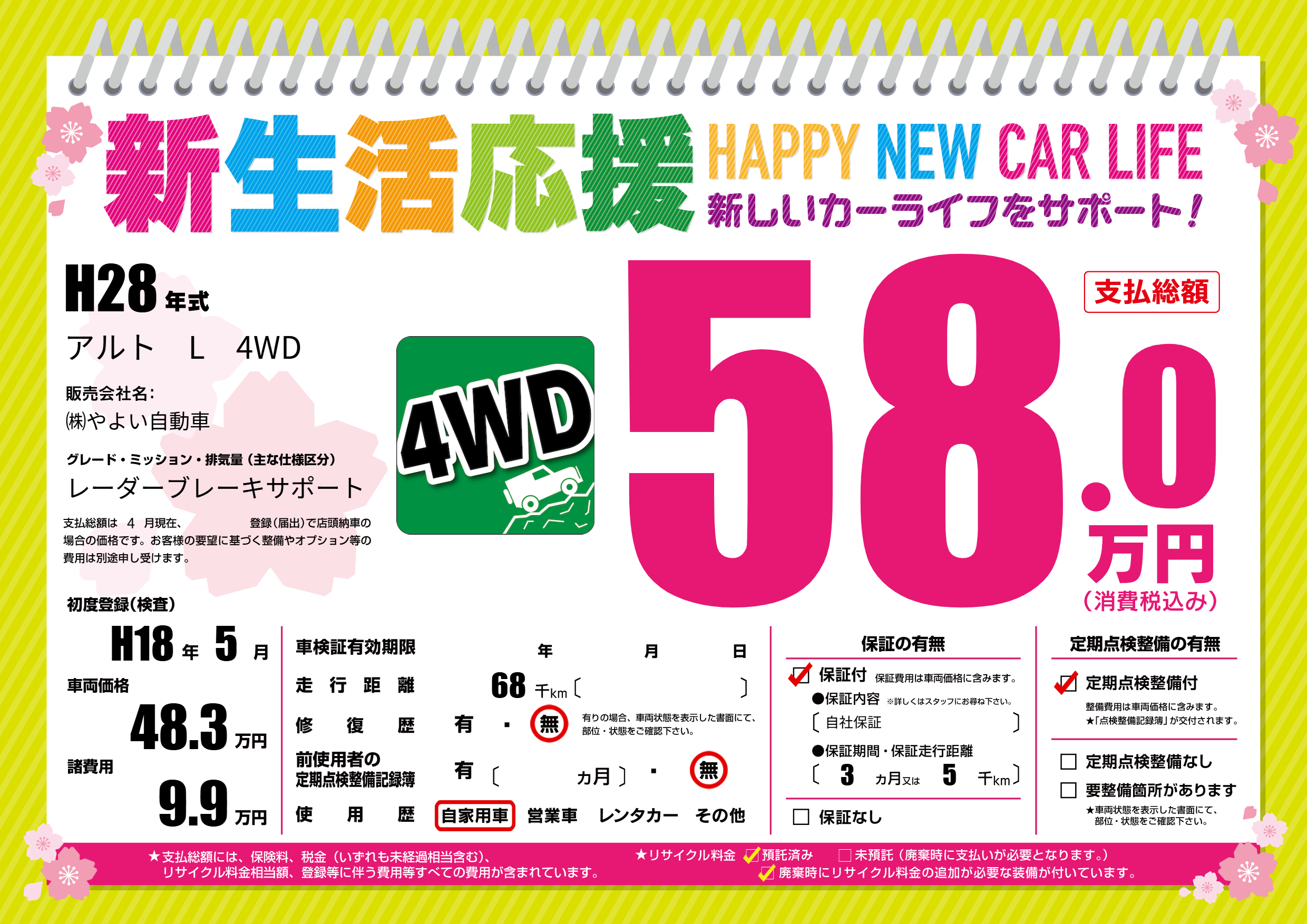 | 車名 | アルト L 4WD | グレード ミッション 排気量 |