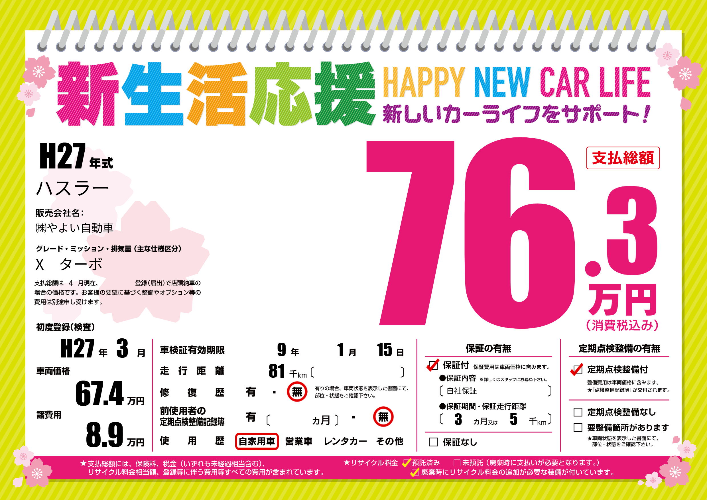 保証付き 保証内容(自社保証) 3ヶ月または(5)千kmまで |