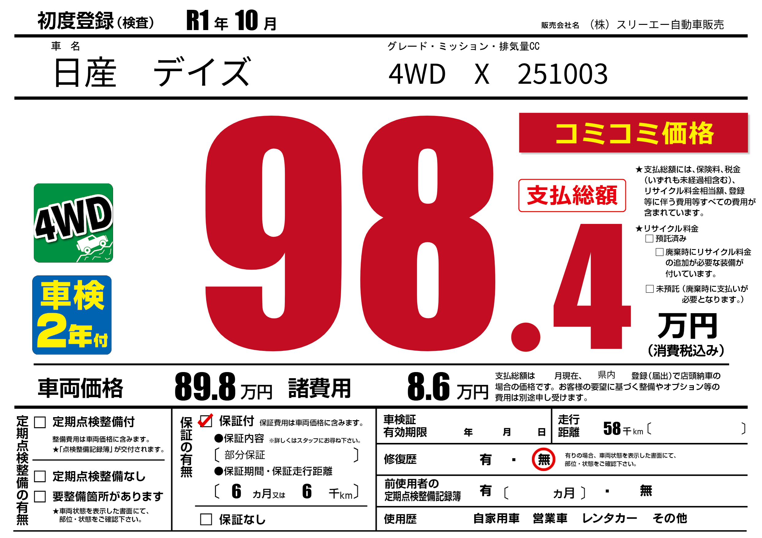 保証付き 保証内容(部分保証) 6ヶ月または(6)千kmまで |