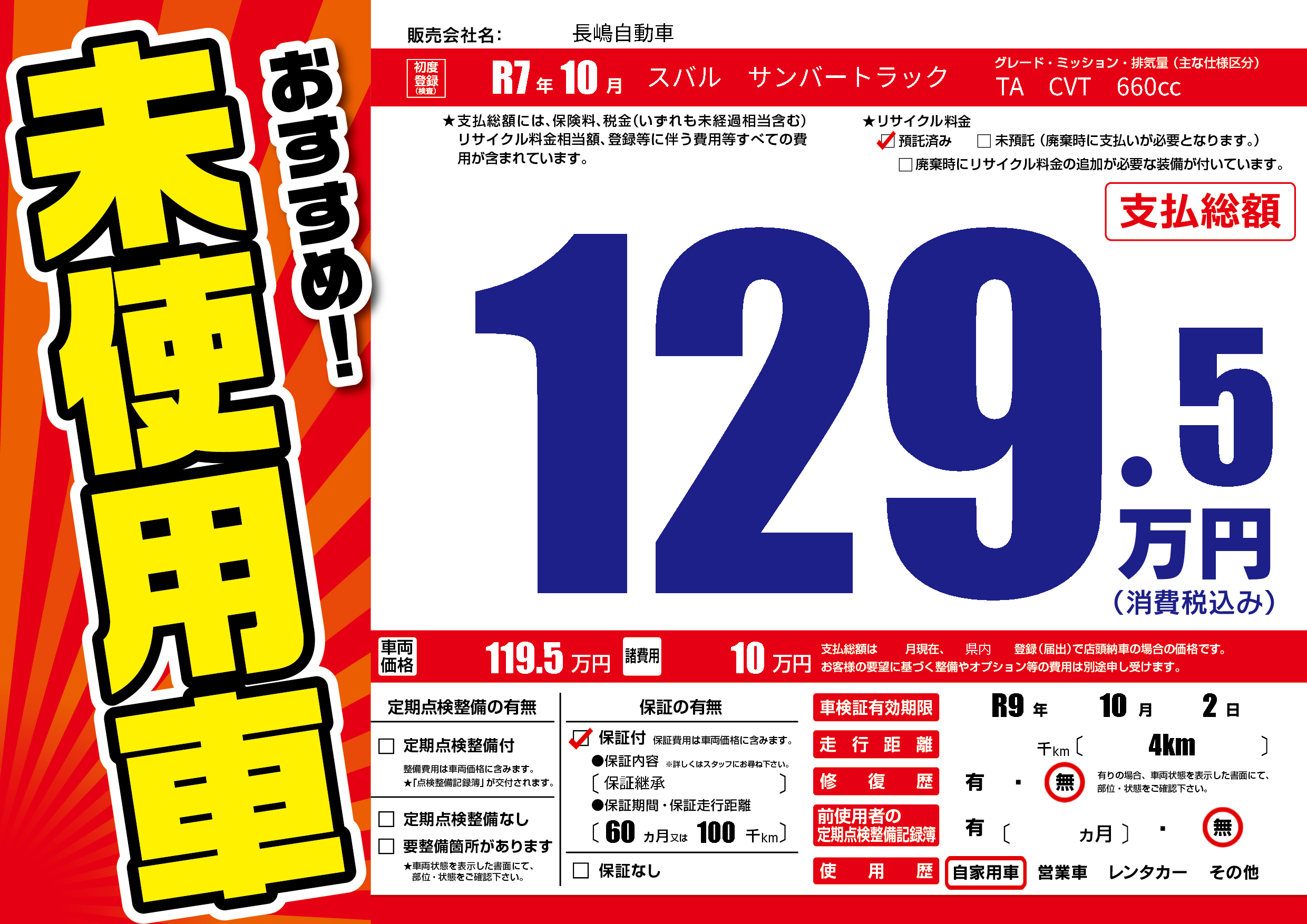 | 走行キロ | - | 初年度登録 | R7年10月 |