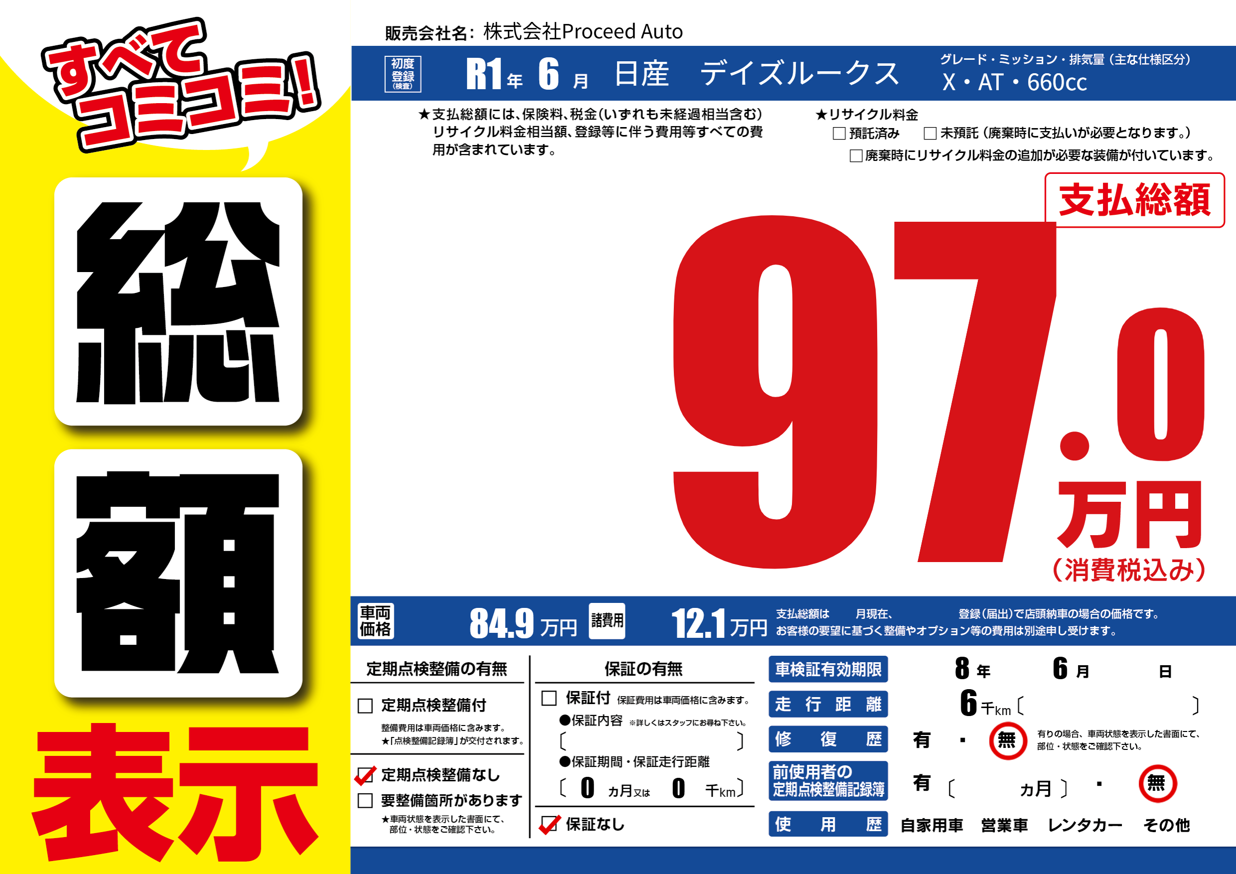 | 車名 | 日産 デイズルークス | グレード ミッション 排気量 |