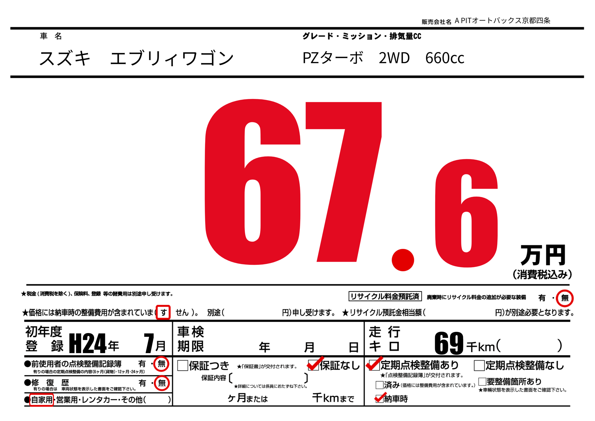 | 車名 | スズキ エブリィワゴン | グレード ミッション 排気量 |