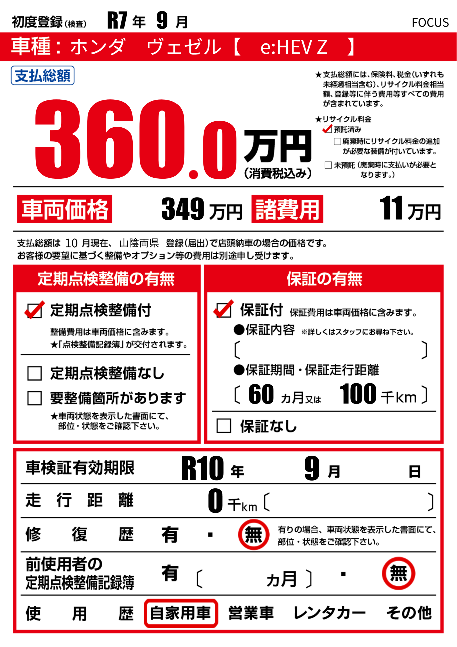 | 車名 | ホンダ ヴェゼル【 e:HEV Z 】 | グレード ミッション 排気量 |