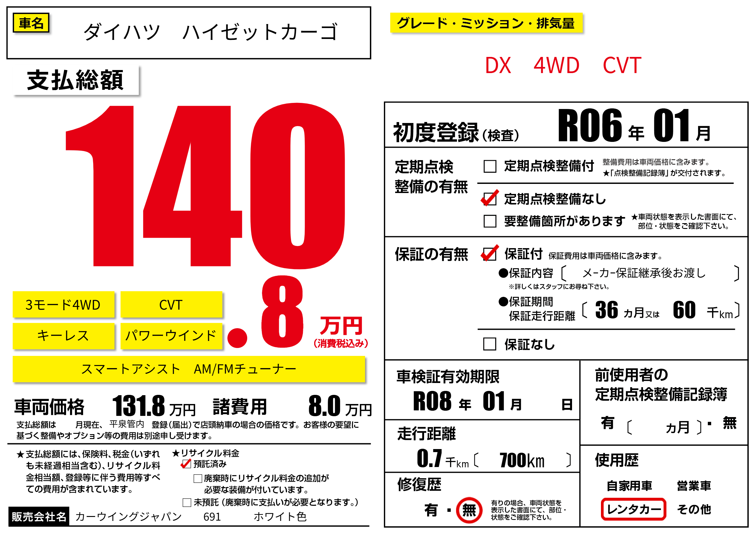 | 車検制限 | R08年 01月 - 日 | ||