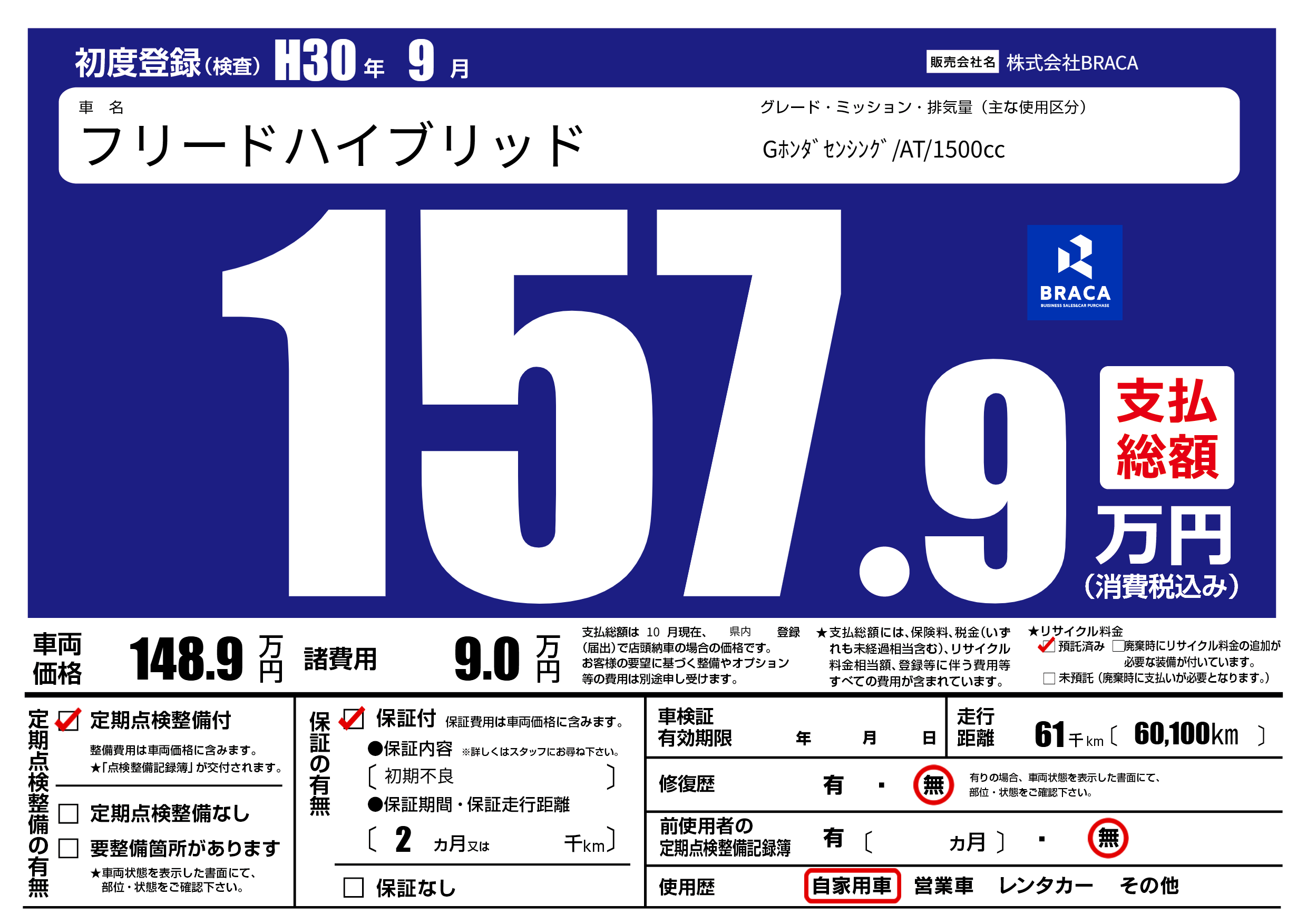 | 走行キロ | 6.1万km | 初年度登録 | H30年9月 |