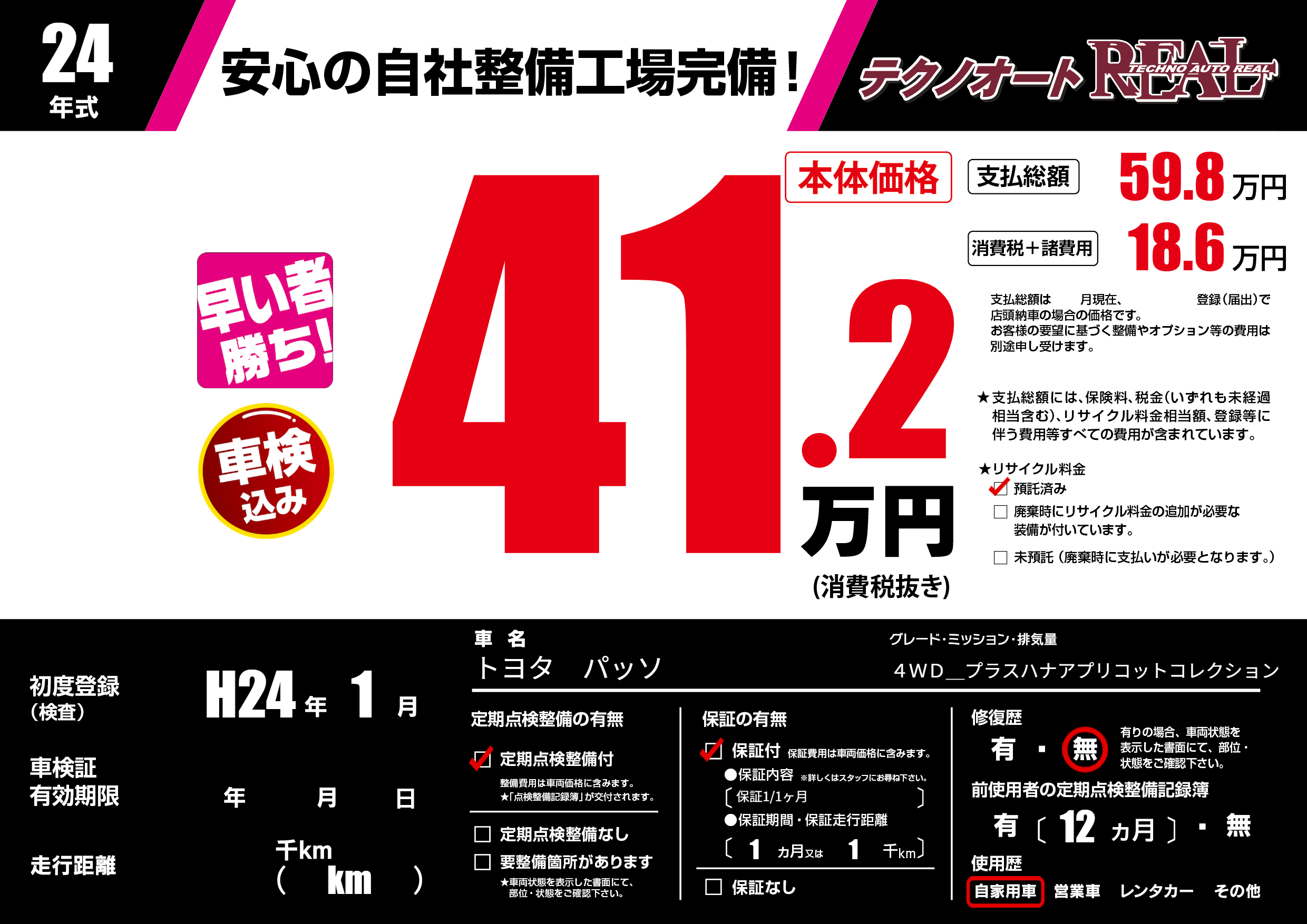 | 車名 | トヨタ パッソ | グレード ミッション 排気量 |