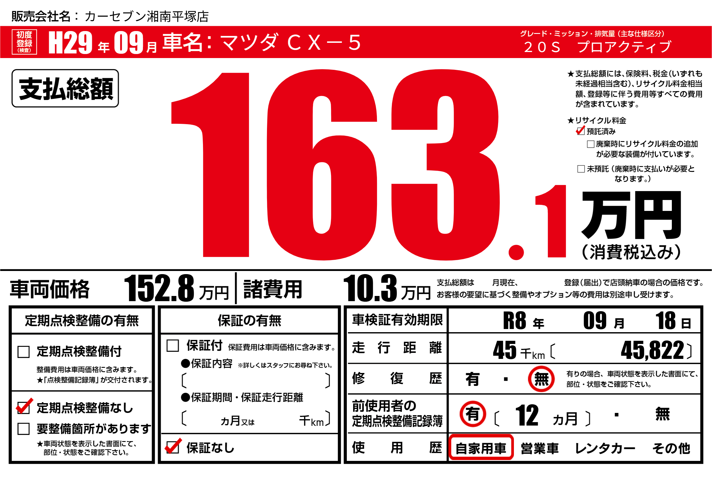 | 車名 | マツダ CX-5 | グレード ミッション 排気量 |