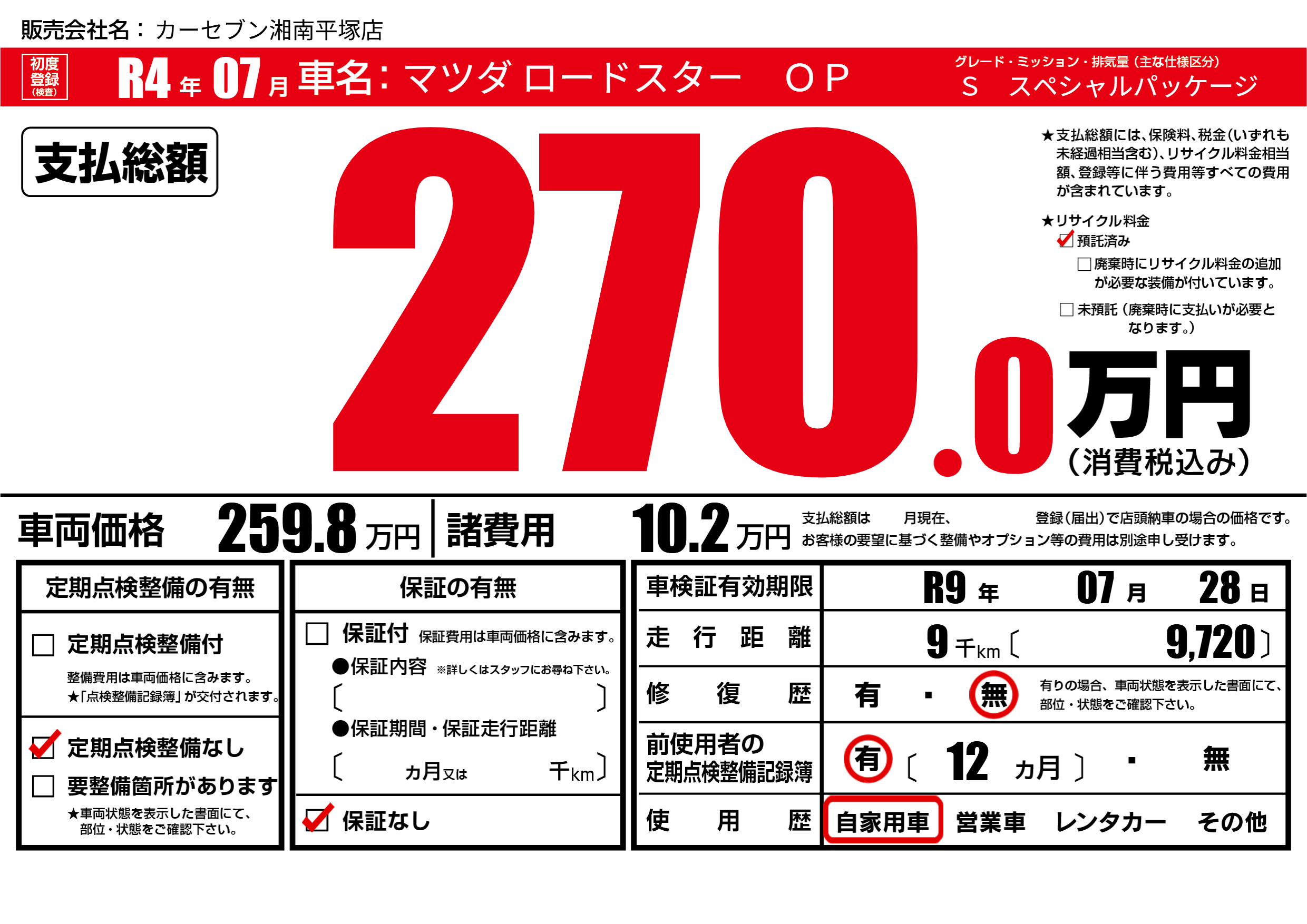 | 車名 | マツダ ロードスター OP | グレード ミッション 排気量 |