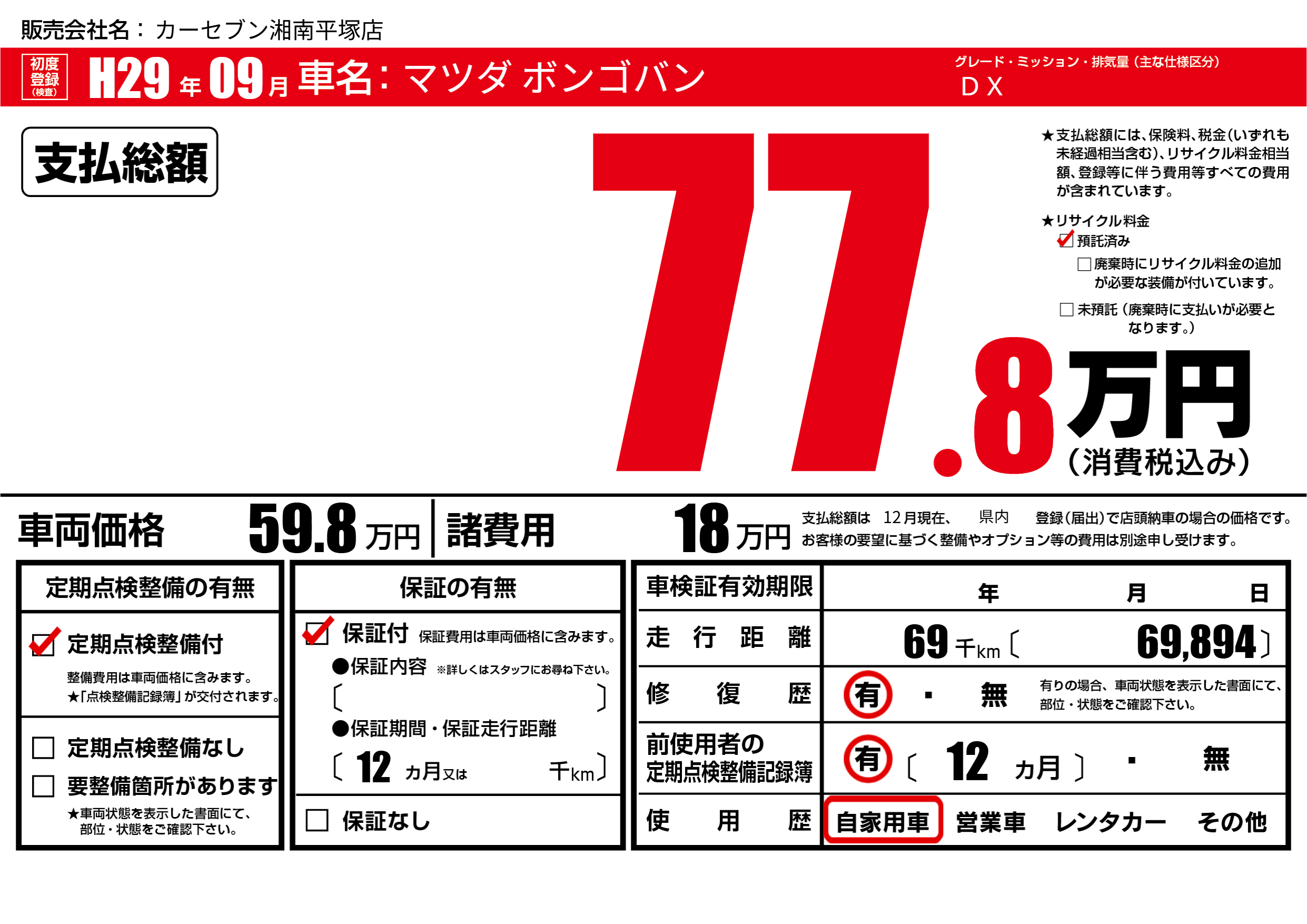 | 車名 | マツダ ボンゴバン | グレード ミッション 排気量 |