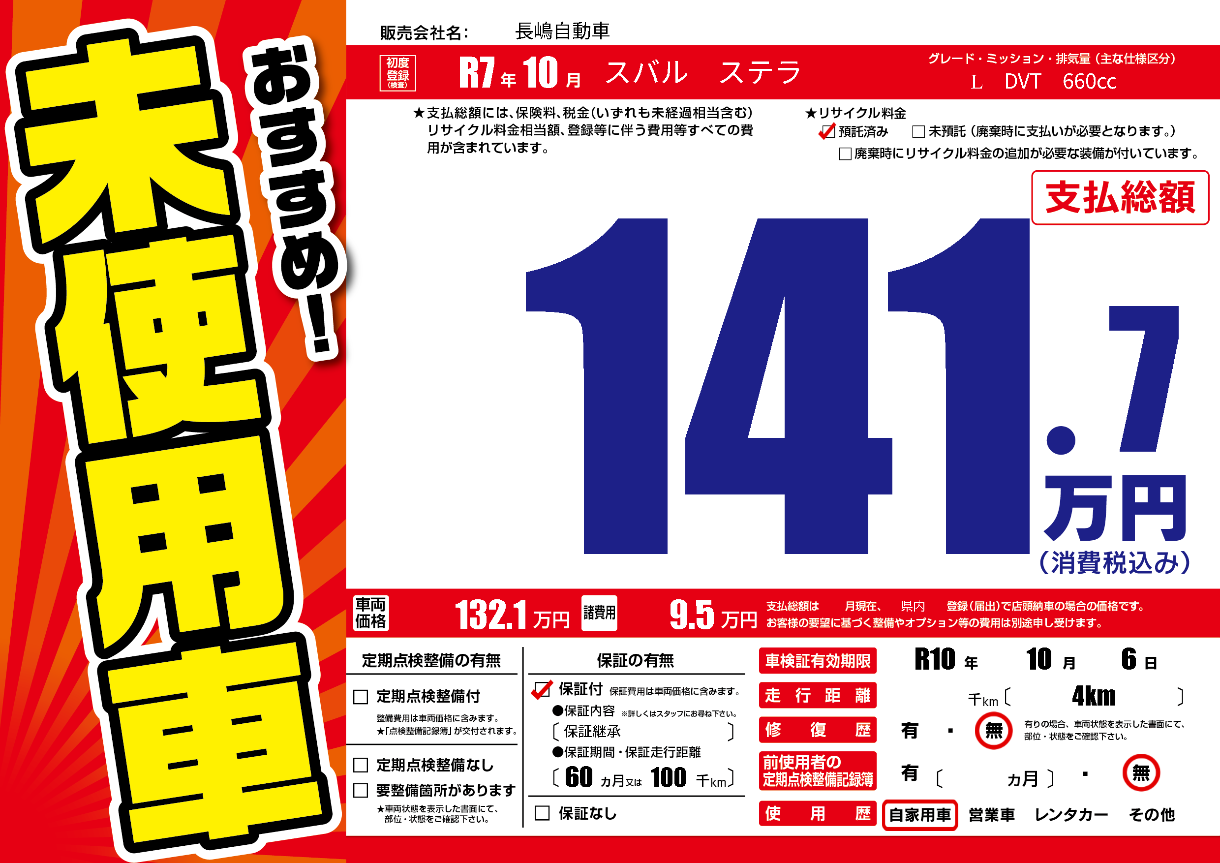 | 走行キロ | - | 初年度登録 | R7年10月 |