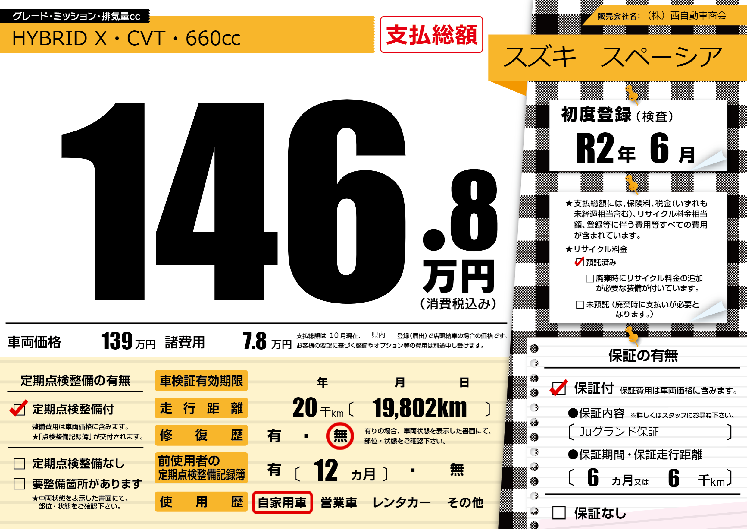 保証付き 保証内容(Juグランド保証) 6ヶ月または6千km |