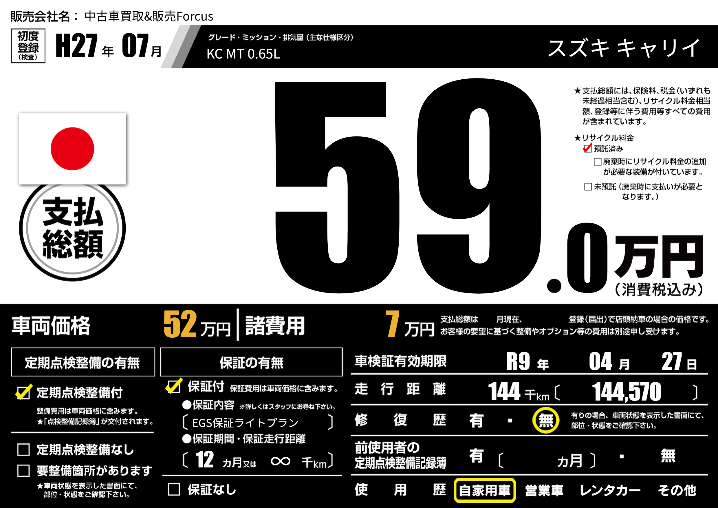 | 走行キロ | 14.4万km | 初年度登録 | H27年07月 |