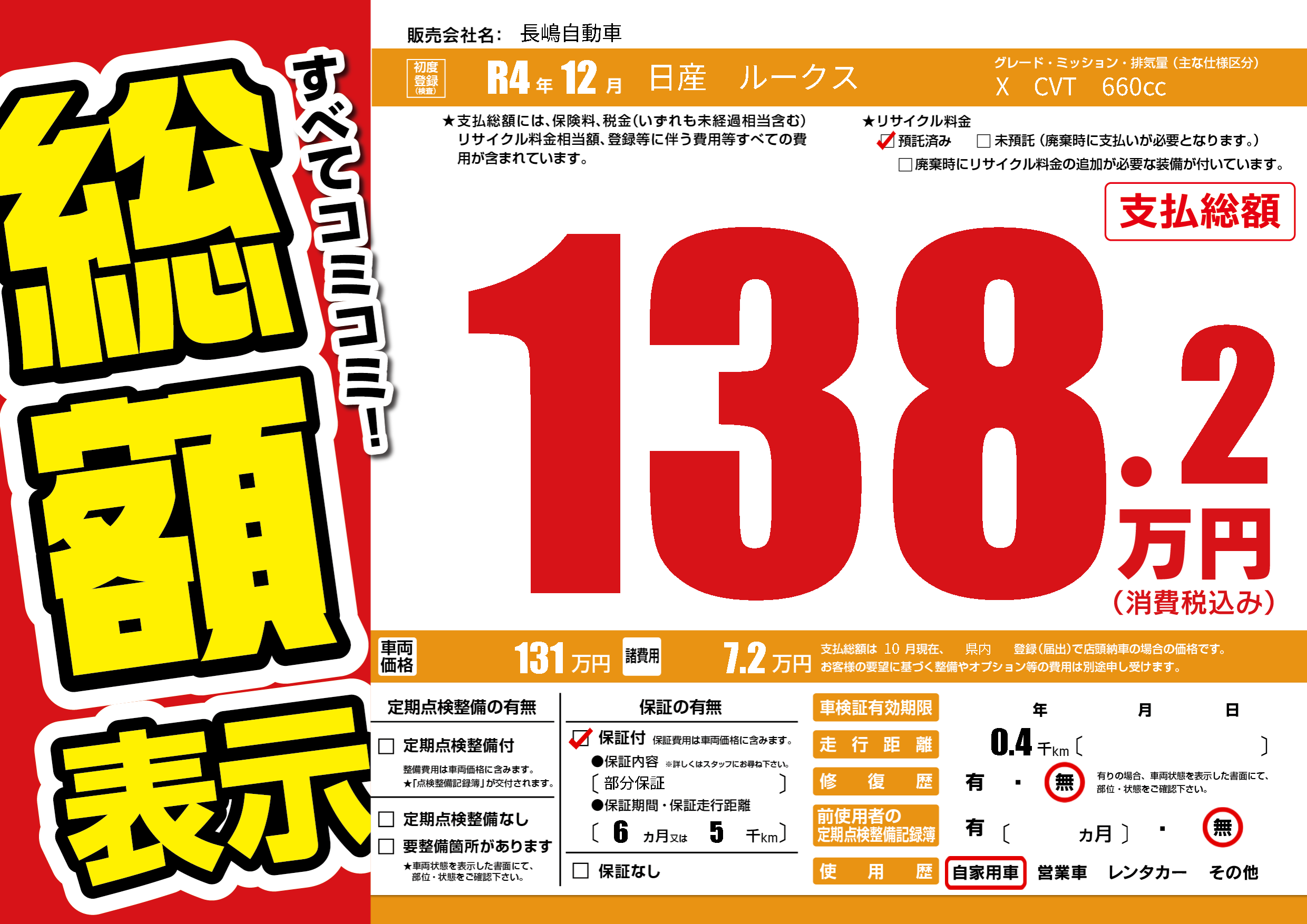 | 車名 | 日産 ルークス | グレード ミッション 排気量 |
